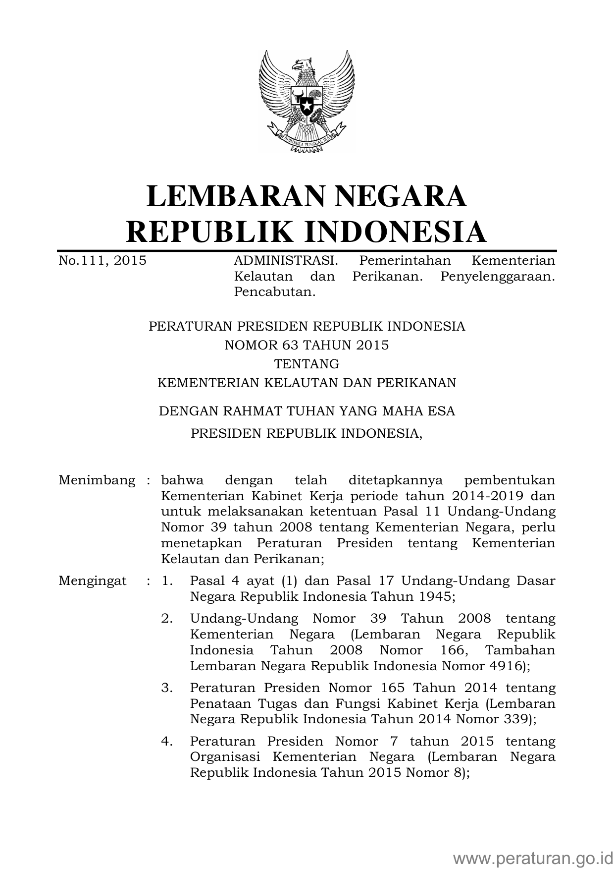 PERPRES Nomor 63 Tahun 2015 | Peraturan Presiden Nomor 63 Tahun 2015 tentang KEMENTERIAN KELAUTAN DAN PERIKANAN