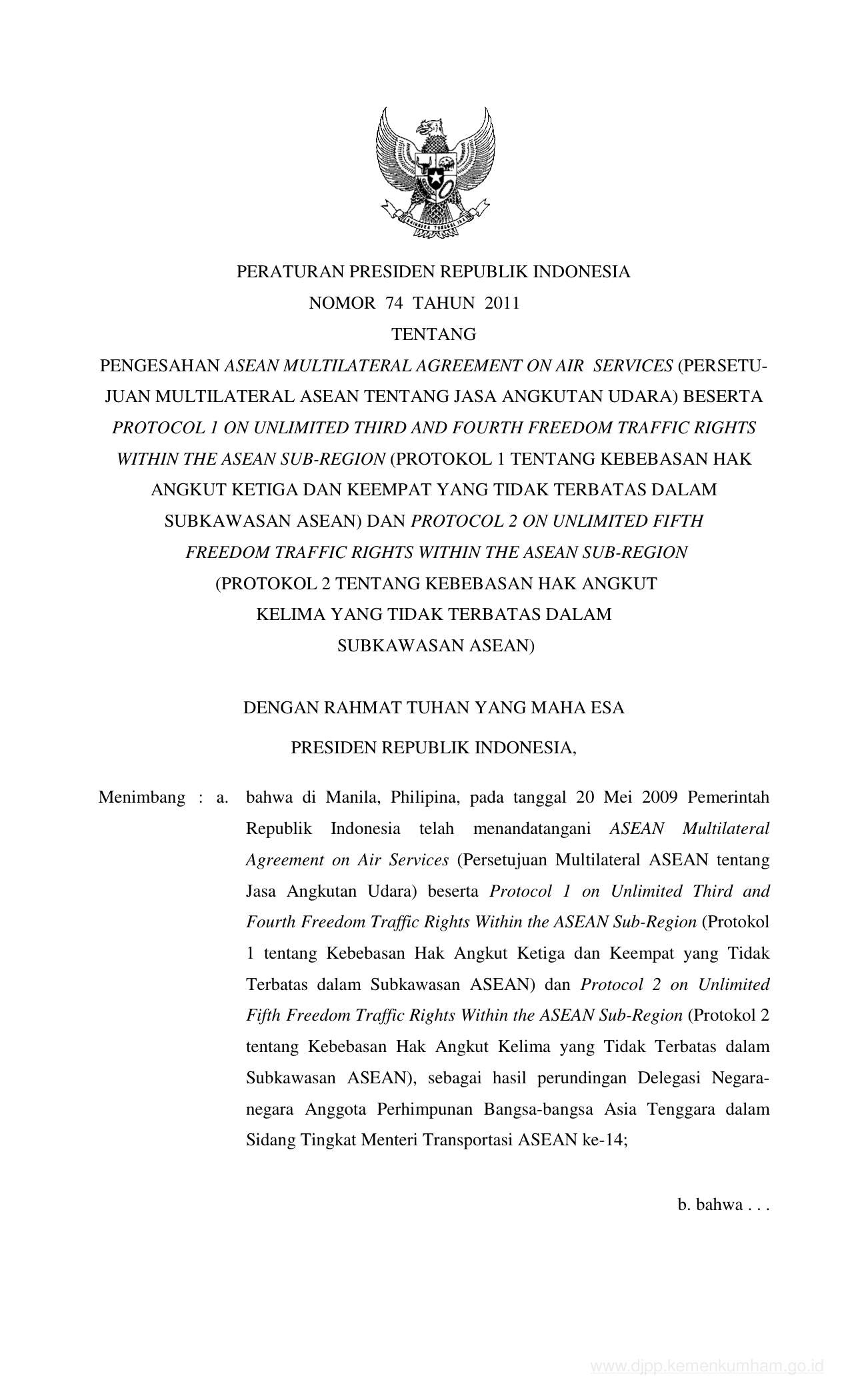 PERPRES Nomor 74 Tahun 2011 | Peraturan Presiden Nomor 74 Tahun 2011 tentang PENGESAHAN ASEAN MULTILATERAL AGREEMENT ON AIR SERVICES (PERSETUJUAN MULTILATERAL ASEAN TENTANG JASA ANGKUTAN UDARA) BESERTA PROTOCOL 1 ON UNLIMITED THIRD AND FOURTH FREEDOM TRAFFIC RIGHTS WITHIN THE ASEAN SUB-REGION (PROTOKOL 1 TENTANG KEBEBASAN HAK ANGKUT KETIGA DAN KEEMPAT YANG TIDAK TERBATAS DALAM SUBKAWASAN ASEAN) DAN PROTOCOL 2 ON UNLIMITED FIFTH FREEDOM TRAFFIC RIGHTS WITHIN THE ASEAN SUB-REGION (PROTOKOL 2 TENTANG KEBEBASAN HAK ANGKUT KELIMA YANG TIDAK TERBATAS DALAM SUBKAWASAN ASEAN)