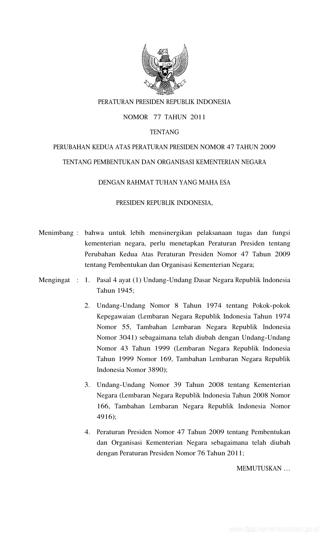 PERPRES Nomor 77 Tahun 2011 | Peraturan Presiden Nomor 77 Tahun 2011 tentang PERUBAHAN KEDUA ATAS PERATURAN PRESIDEN NOMOR 47 TAHUN 2009 TENTANG PEMBENTUKAN DAN ORGANISASI KEMENTERIAN NEGARA