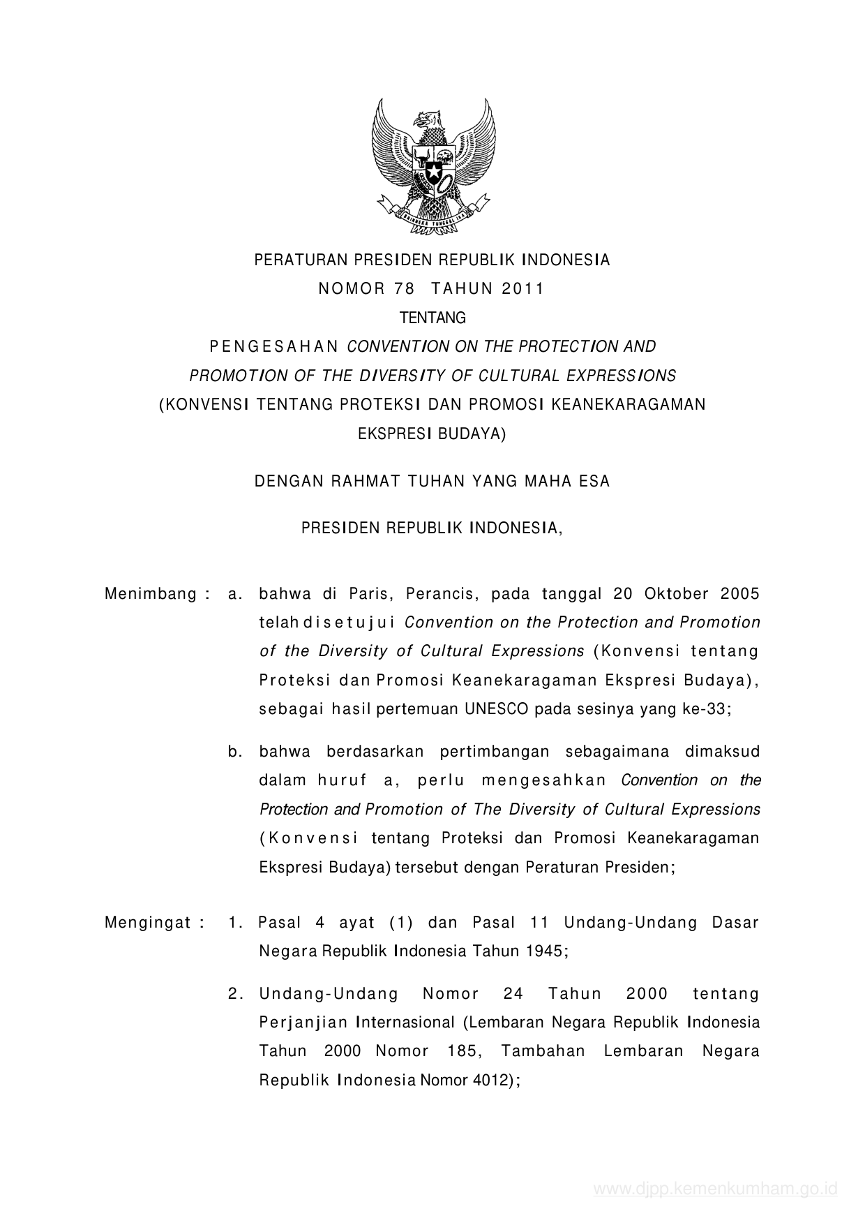 PERPRES Nomor 78 Tahun 2011 | Peraturan Presiden Nomor 78 Tahun 2011 tentang PENGESAHAN CONVENTION ON THE PROTECTION AND PROMOTION OF THE DIVERSITY OF CULTURAL EXPRESSIONS (KONVENSI TENTANG PROTEKSI DAN PROMOSI KEANEKARAGAMAN EKSPRESI BUDAYA)