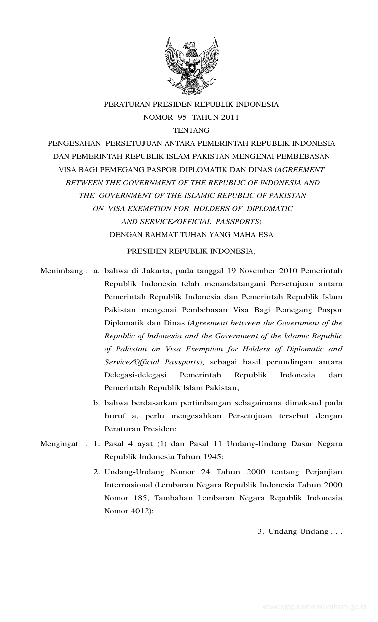 PERPRES Nomor 95 Tahun 2011 | Peraturan Presiden Nomor 95 Tahun 2011 tentang PENGESAHAN PERSETUJUAN ANTARA PEMERINTAH REPUBLIK INDONESIA DAN PEMERINTAH REPUBLIK ISLAM PAKISTAN MENGENAI PEMBEBASAN VISA BAGI PEMEGANG PASPOR DIPLOMATIK DAN DINAS (AGREEMENT BETWEEN THE GOVERNMENT OF THE REPUBLIC OF INDONESIA AND THE GOVERNMENT OF THE ISLAMIC REPUBLIC OF PAKISTAN ON VISA EXEMPTION FOR HOLDERS OF DIPLOMATIC AND SERVICE/OFFICIAL PASSPORTS)