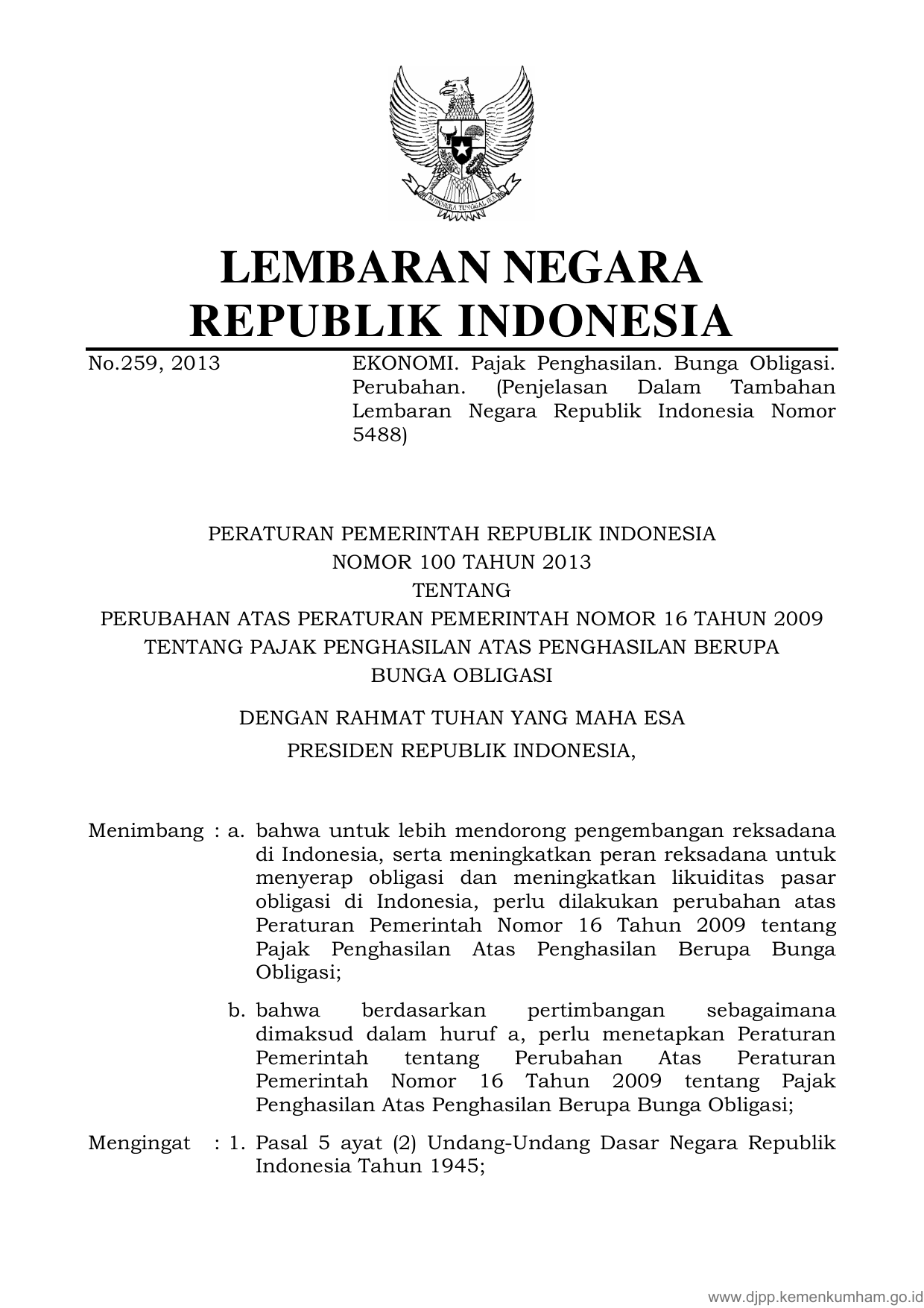 PP Nomor 100 Tahun 2013 | Peraturan Pemerintah Nomor 100 Tahun 2013 tentang PERUBAHAN ATAS PERATURAN PEMERINTAH NOMOR 16 TAHUN 2009 TENTANG PAJAK PENGHASILAN DAN PENGHASILAN BERUPA BUNGA OBLIGASI