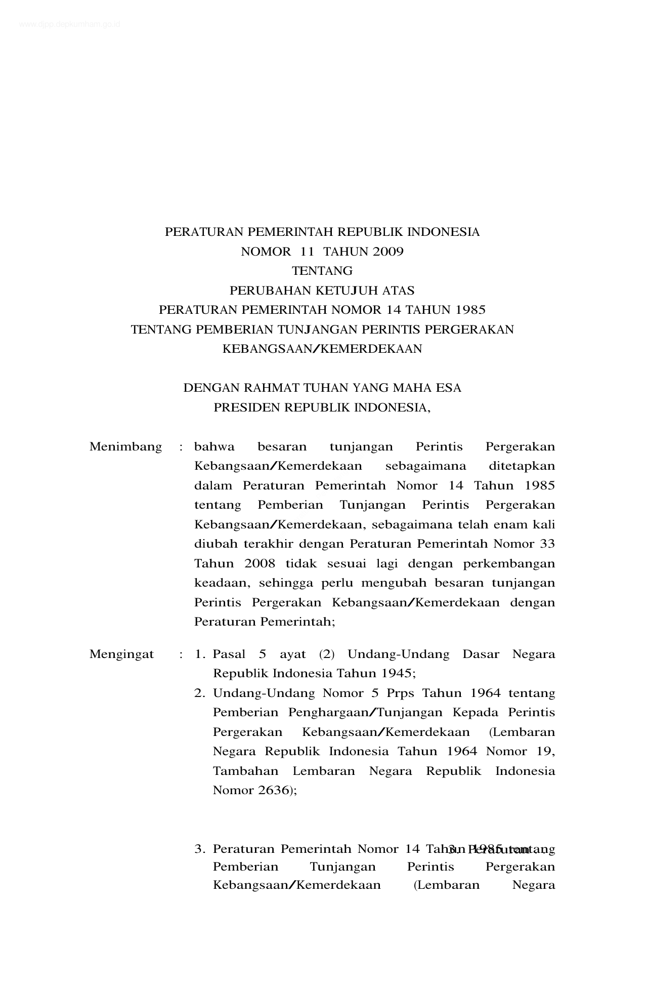 PP Nomor 11 Tahun 2009 | Peraturan Pemerintah Nomor 11 Tahun 2009 tentang PERUBAHAN KETUJUH PP 14-1985 TENTANG PEMBERIAN TUNJANGAN PERINTIS PERGERAKAN KEBANGSAAN/KEMERDEKAAN