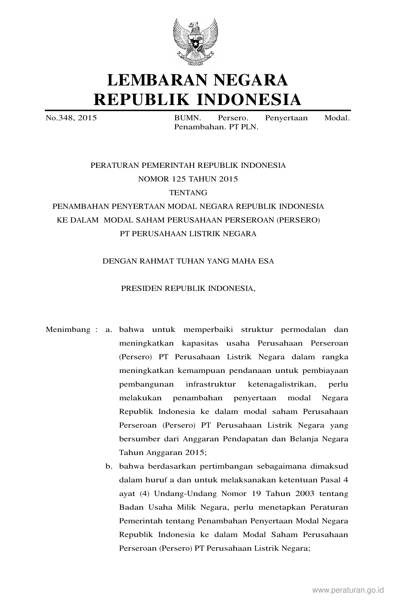 PP Nomor 125 Tahun 2015 | Peraturan Pemerintah Nomor 125 Tahun 2015 tentang PENAMBAHAN PENYERTAAN MODAL NEGARA REPUBLIK INDONESIA KE DALAM SAHAM PERUSAHAAN PERSEROAN PERSERO PT PERUSAHAAN LISTRIK NEGARA