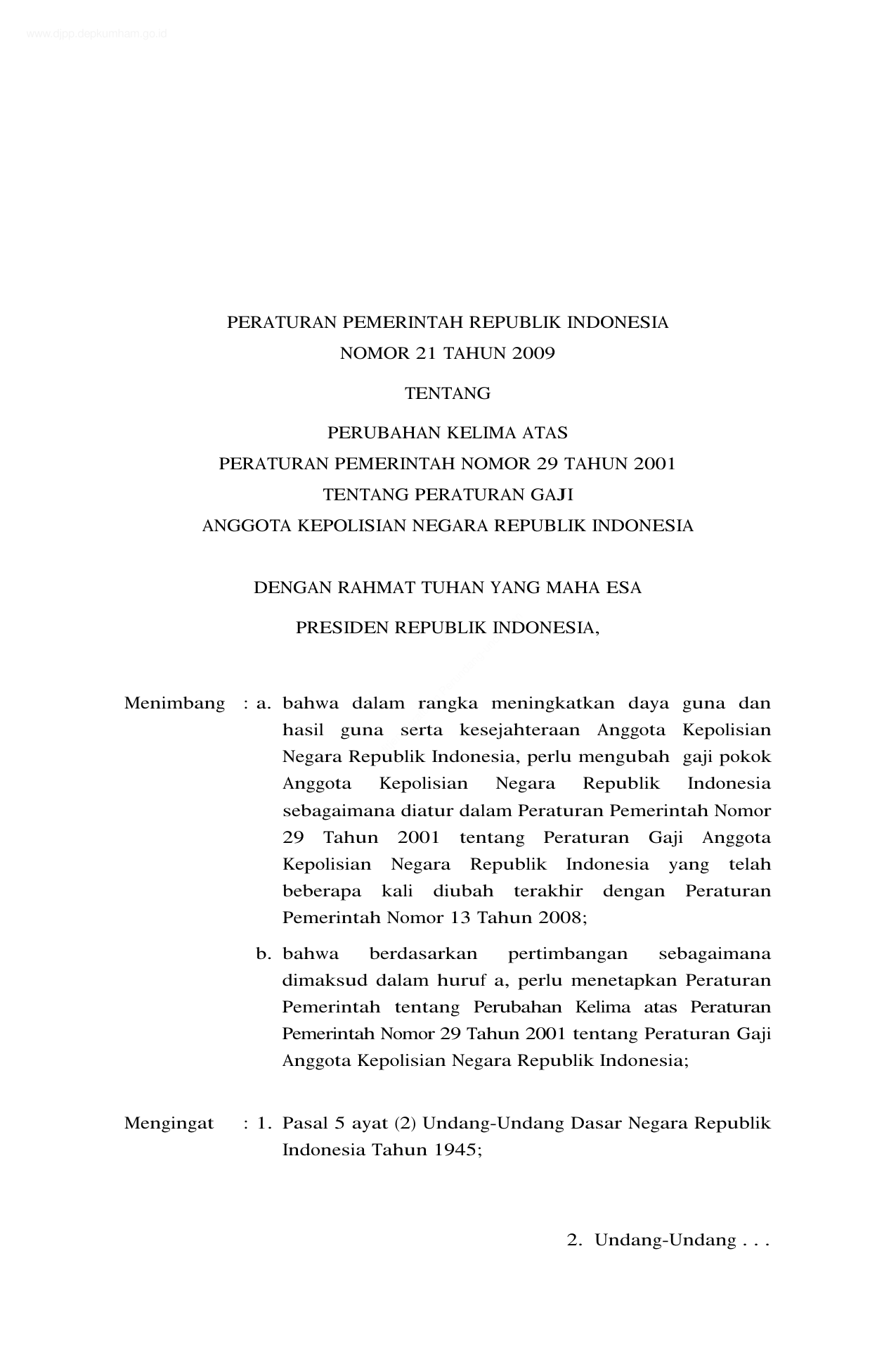 PP Nomor 21 Tahun 2009 | Peraturan Pemerintah Nomor 21 Tahun 2009 tentang PERUBAHAN KELIMA PP 29-2001 TENTANG PERATURAN GAJI ANGGOTA KEPOLISIAN NEGARA REPUBLIK INDONESIA