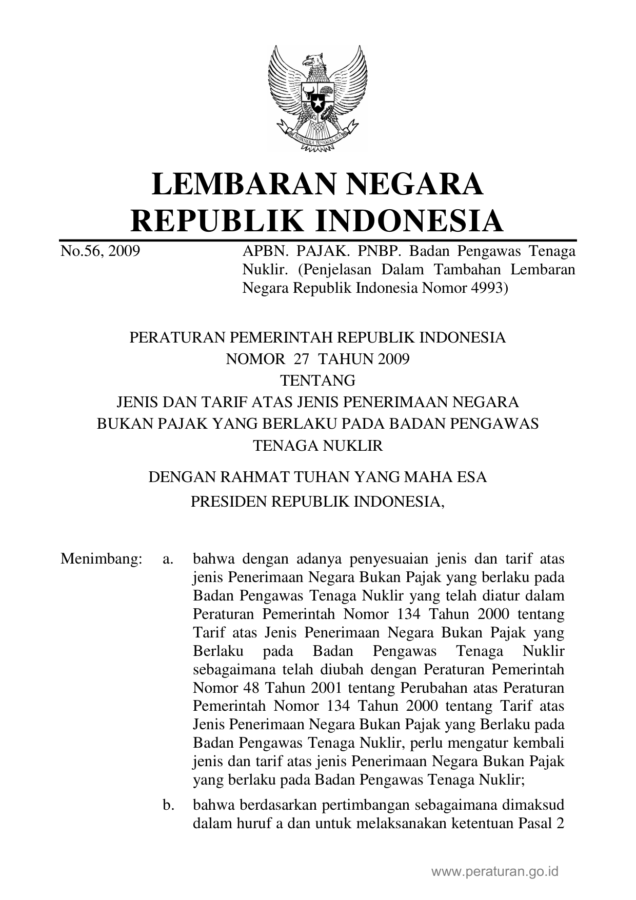 PP Nomor 27 Tahun 2009 | Peraturan Pemerintah Nomor 27 Tahun 2009 tentang Jenis dan Tarif Atas Jenis Penerimaan Negara Bukan Pajak yang Berlaku Pada Badan Pengawas Tenaga Nuklir