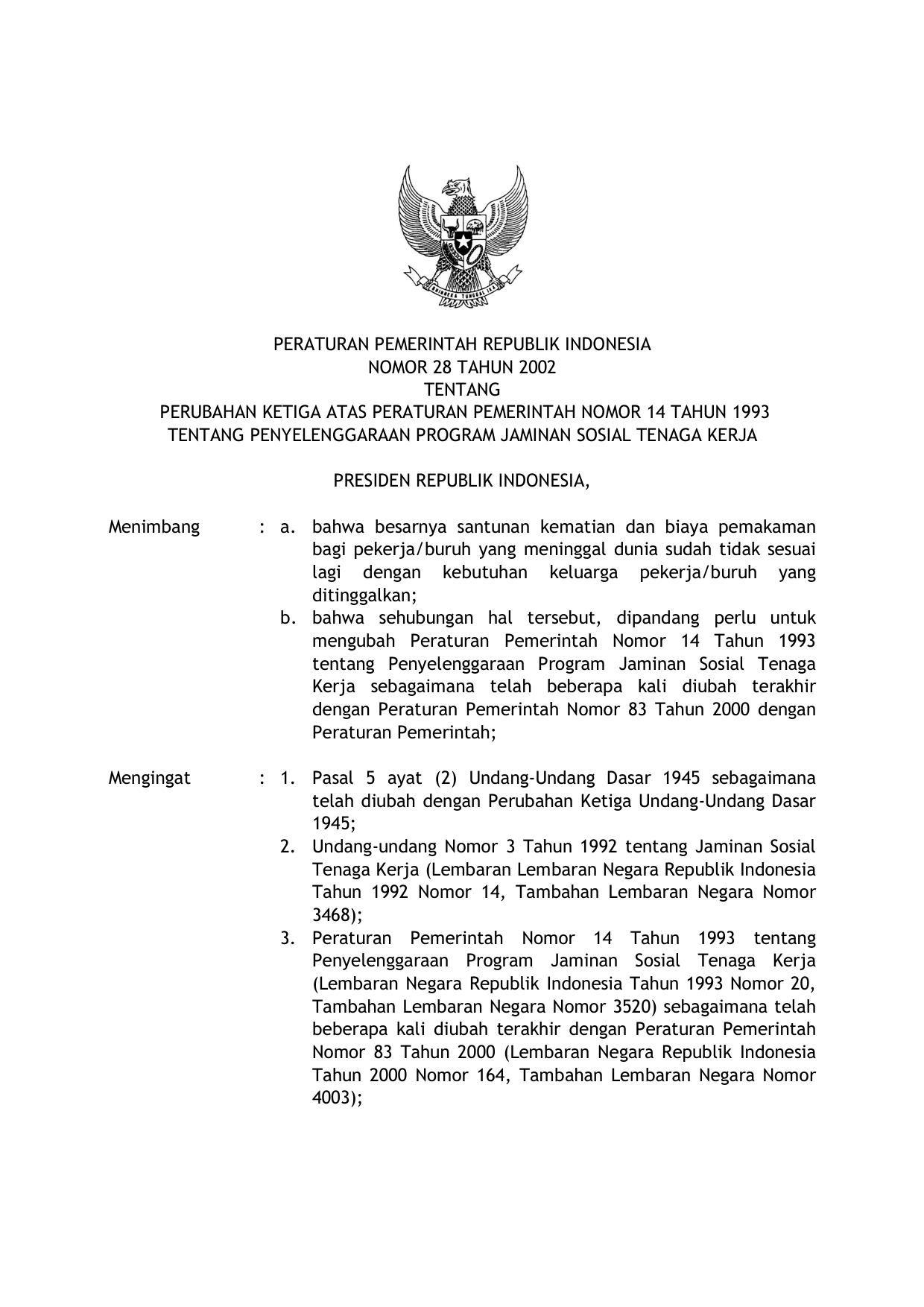 PP Nomor 28 Tahun 2002 | Peraturan Pemerintah Nomor 28 Tahun 2002 tentang PERUBAHAN KETIGA ATAS PERATURAN PEMERINTAH NOMOR 14 TAHUN 1993 TENTANG PENYELENGGARAAN PROGRAM JAMINAN SOSIAL TENAGA KERJA