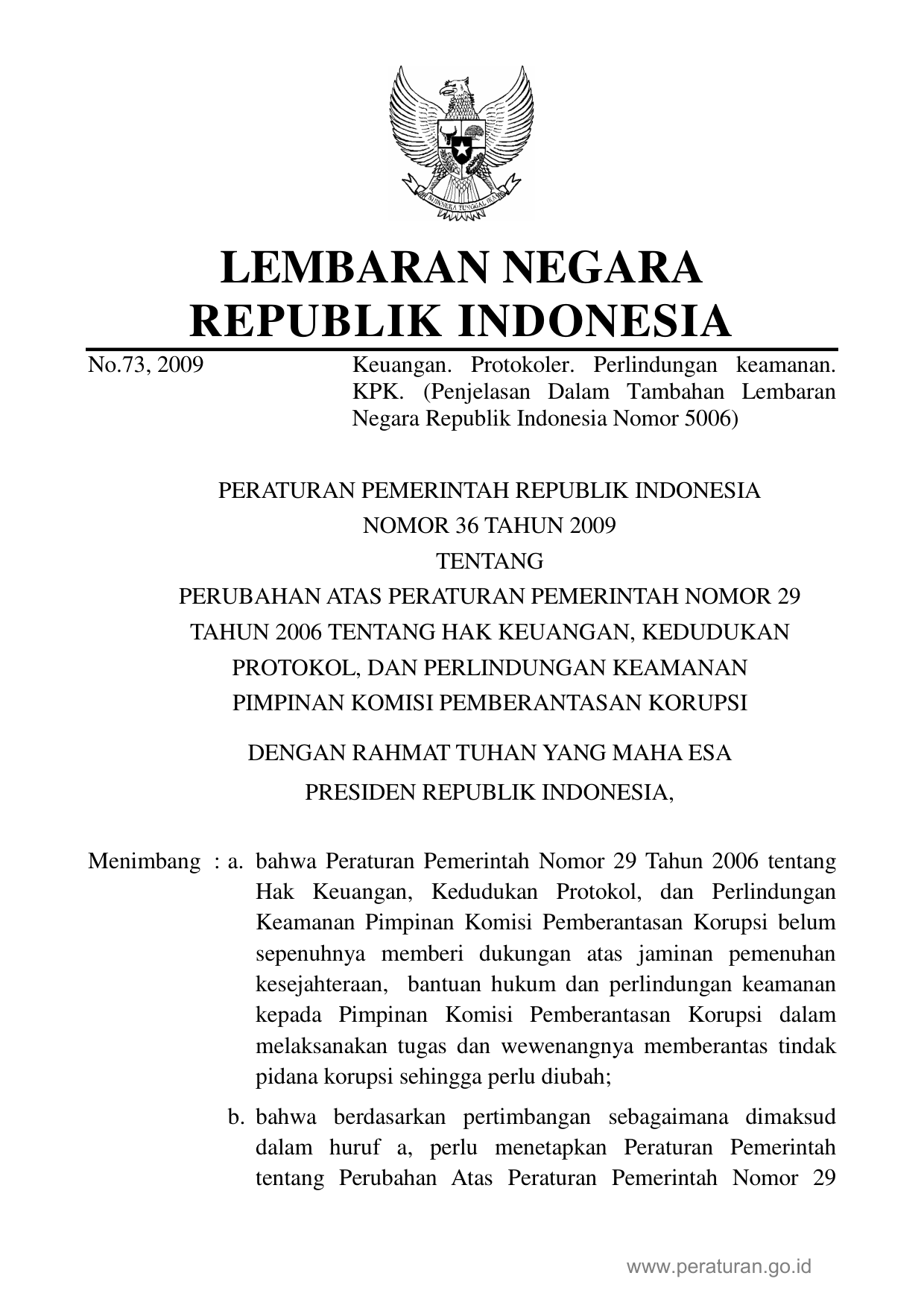 PP Nomor 36 Tahun 2009 | Peraturan Pemerintah Nomor 36 Tahun 2009 tentang Perubahan Atas Peraturan Pemerintah Nomor 29 Tahun 2006 tentang Hak Keuangan, Kedudukan Protokol, dan Perlindungan Keamanan Pimpinan Komisi Pemberantasan Korupsi