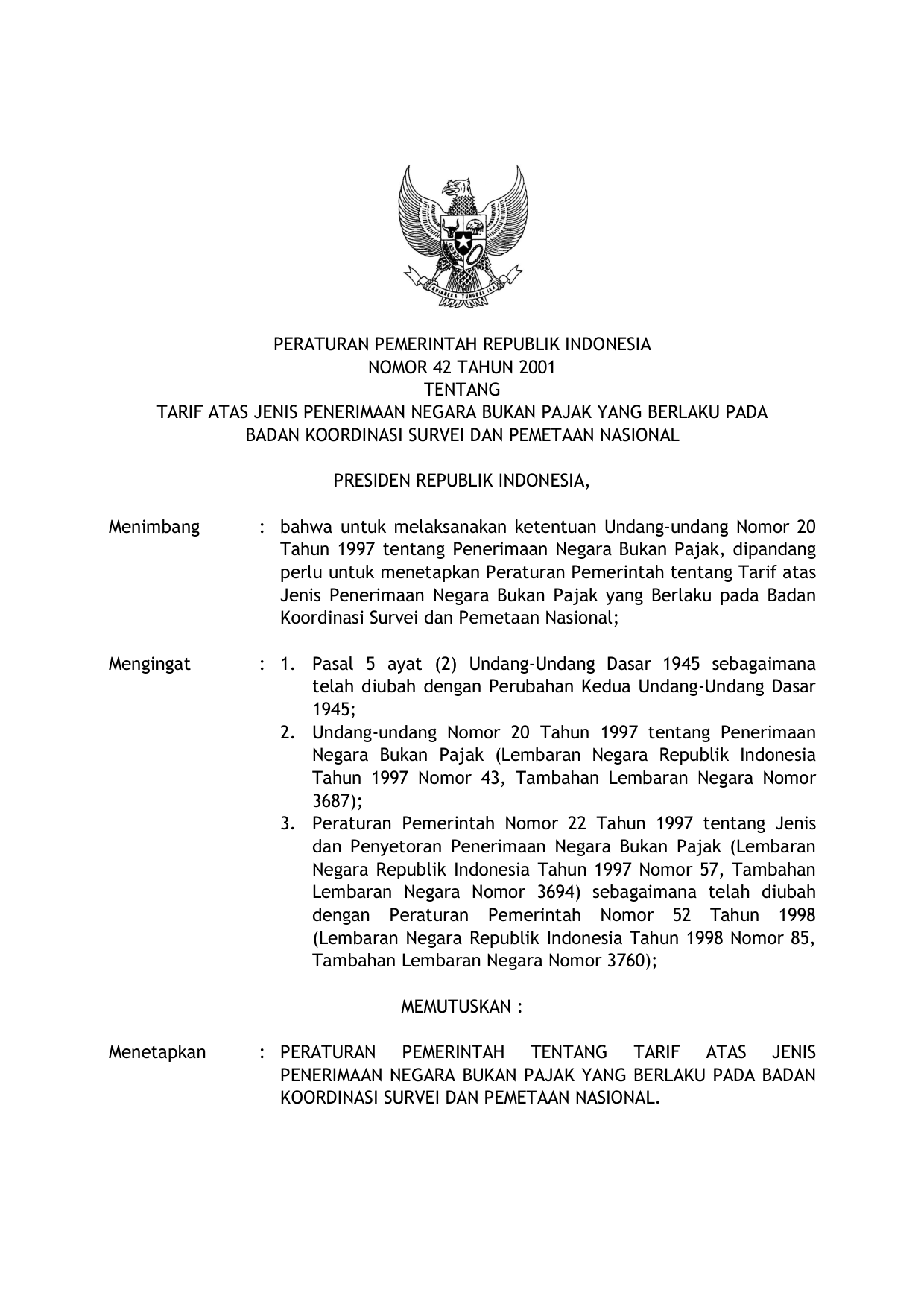 PP Nomor 42 Tahun 2001 | Peraturan Pemerintah Nomor 42 Tahun 2001 tentang TARIF ATAS JENIS PENERIMAAN NEGARA BUKAN PAJAK YANG BERLAKU PADA BADAN KOORDINASI SURVEI DAN PEMETAAN NASIONAL