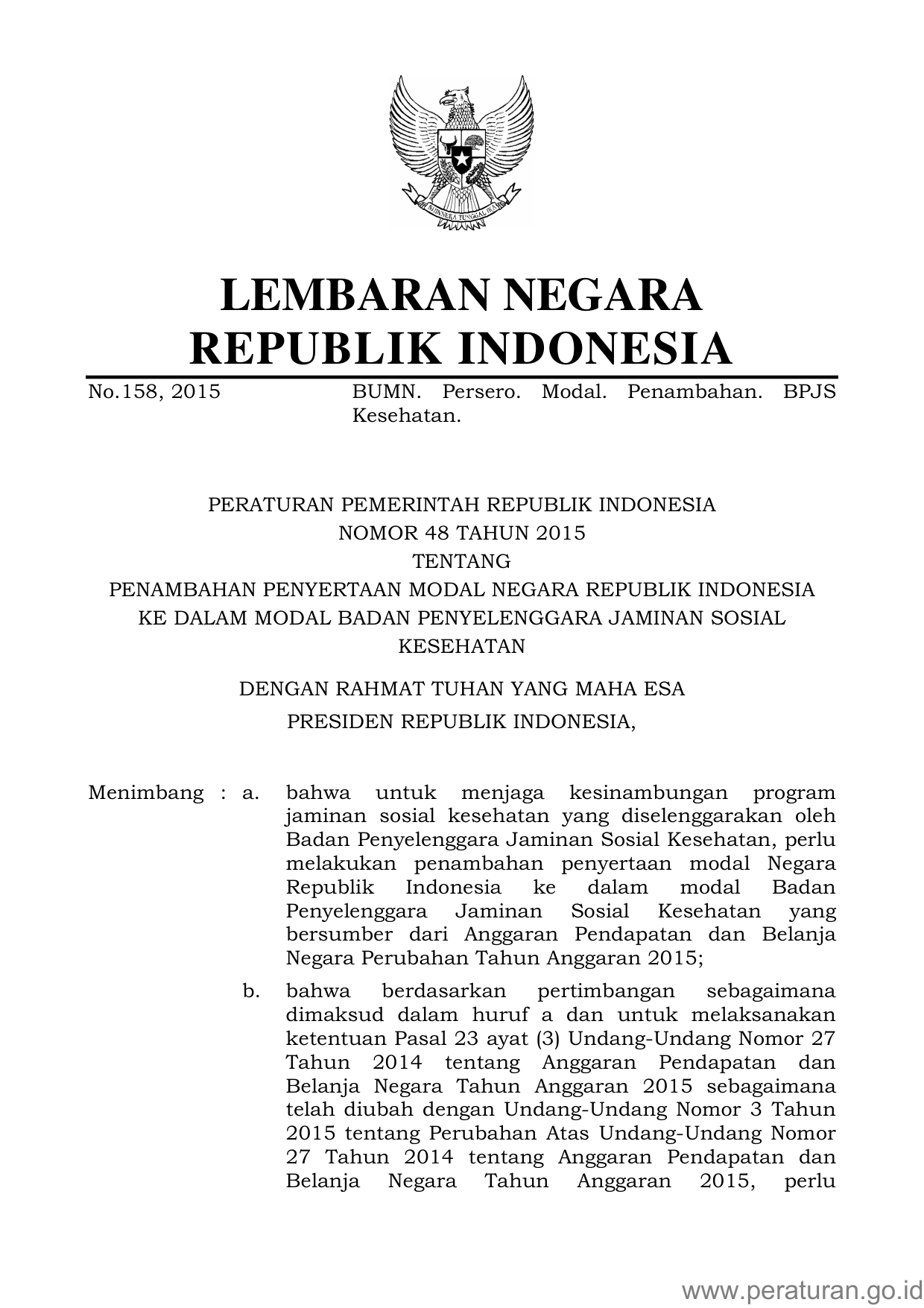 PP Nomor 48 Tahun 2015 | Peraturan Pemerintah Nomor 48 Tahun 2015 tentang PENAMBAHAN PENYERTAAN MODAL NEGARA REPUBLIK INDONESIA KE DALAM MODAL BADAN PENYELENGGARA JAMINAN SOSIAL KESEHATAN