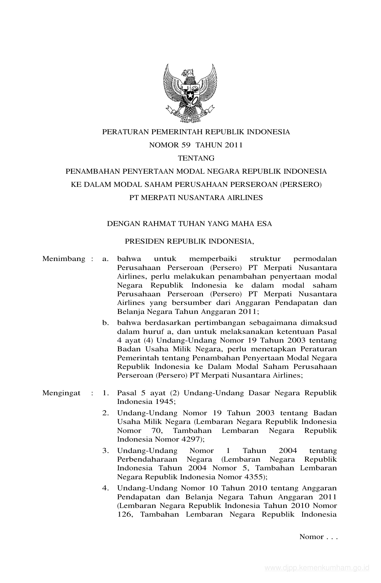 PP Nomor 59 Tahun 2011 | Peraturan Pemerintah Nomor 59 Tahun 2011 tentang PENAMBAHAN PENYERTAAN MODAL NEGARA REPUBLIK INDONESIA KE DALAM MODAL SAHAM PERUSAHAAN PERSEROAN (PERSERO) PT MERPATI NUSANTARA AIRLINES