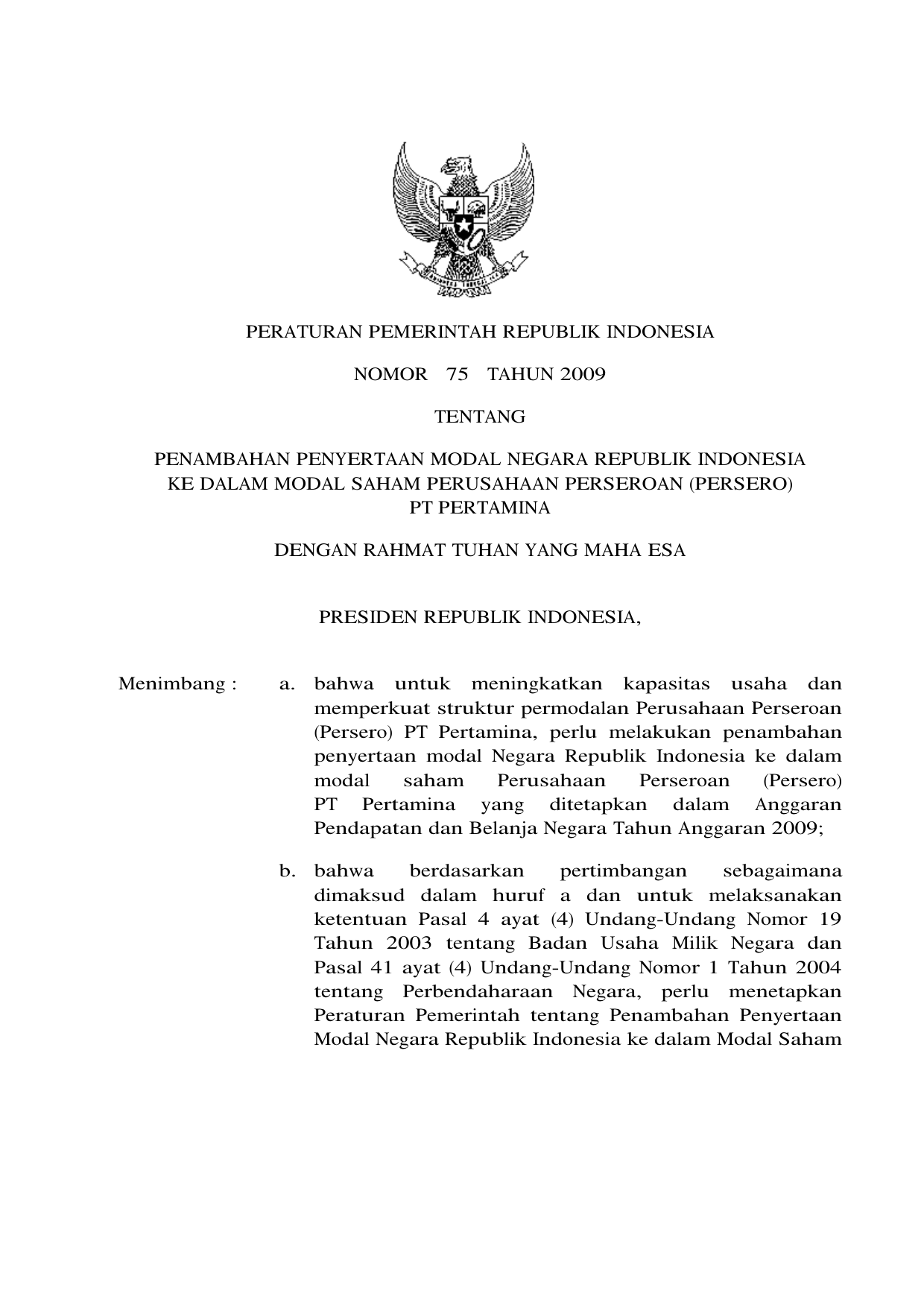 PP Nomor 75 Tahun 2009 | Peraturan Pemerintah Nomor 75 Tahun 2009 tentang PENAMBAHAN PENYERTAAN MODAL NEGARA REPUBLIK INDONESIA KEDALAM MODAL SAHAM PERUSAHAAN PERSEROAN (PERSERO) PT PERTAMINA