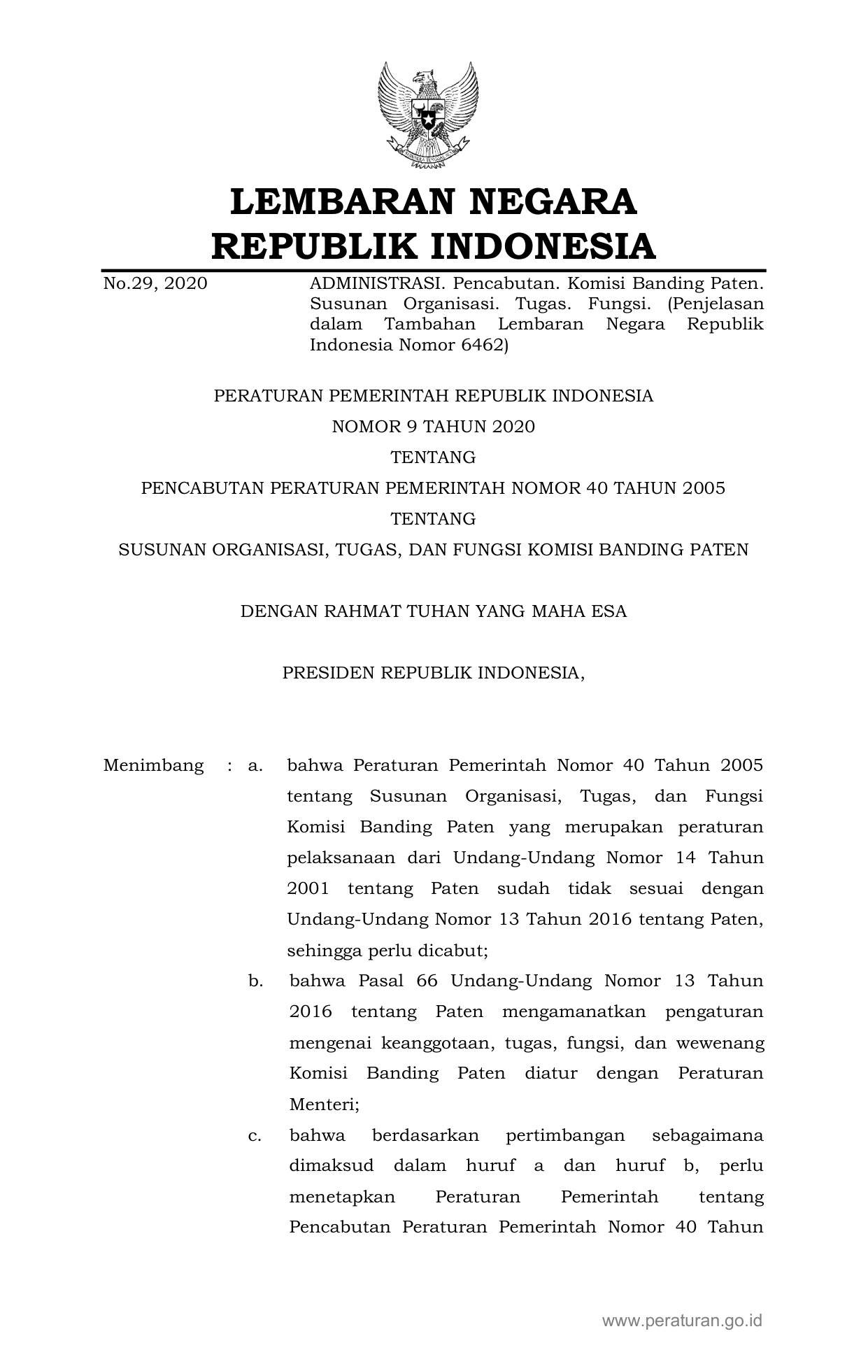 PP Nomor 9 Tahun 2020 | Peraturan Pemerintah Nomor 9 Tahun 2020 tentang PENCABUTAN PERATURAN PEMERINTAH NOMOR 40 TAHUN 2005 TENTANG SUSUNAN ORGANISASI, TUGAS, DAN FUNGSI KOMISI BANDING PATEN