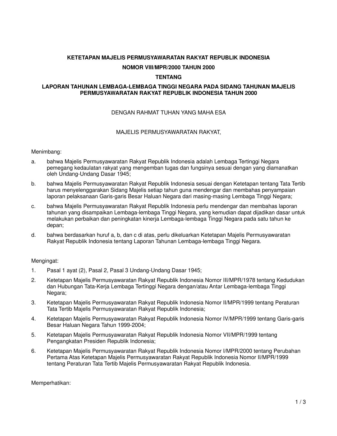 TAP_MPR Nomor viii-mpr-2000 Tahun 2000 | Ketetapan Majelis Permusyawaratan Rakyat Nomor viii-mpr-2000 Tahun 2000 tentang LAPORAN TAHUNAN LEMBAGA LEMBAGA TINGGI NEGARA PADA SIDANG TAHUNAN MAJELIS PERMUSYAWARATAN RAKYAT RI TAHUN 2000
