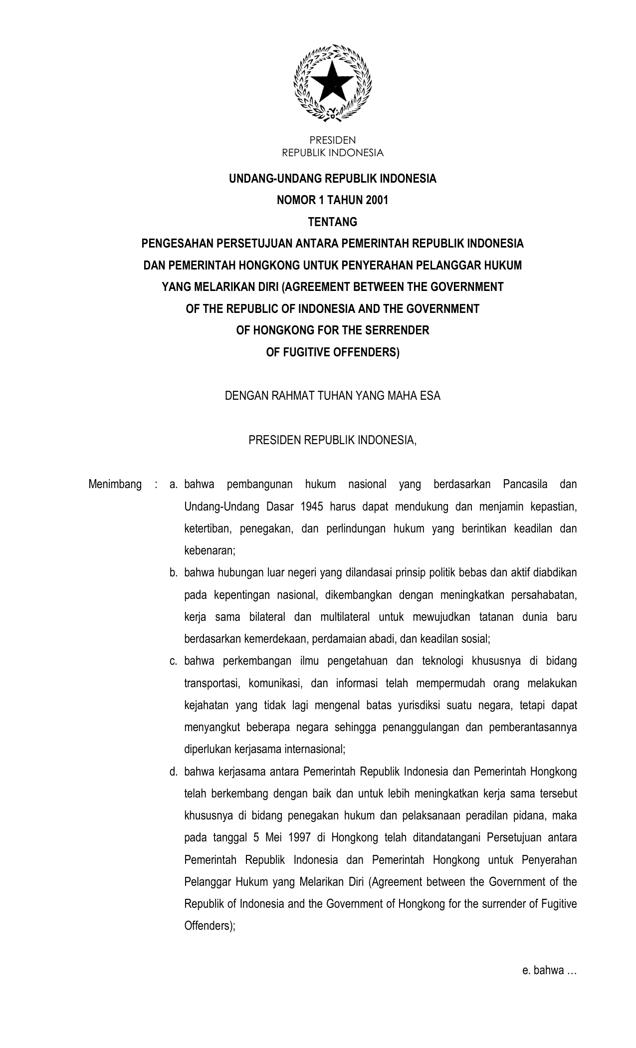 UU Nomor 1 Tahun 2001 | Undang-Undang Nomor 1 Tahun 2001 tentang PENGESAHAN PERSETUJUAN ANTARA PEMERINTAH RI DAN PEMERINTAH HONGKONG UNTUK PENYERAHAN PELANGGAR HUKUM YANG MELARIKAN DIRI (AGREEMENT BETWEEN THE GOVERNMENT OF THE REPUBLIC OF INDONESIA AND THE GOVERNMENT OF HONGKONG FOR THE SURRENDER OF FUGITIVE OFFENDERS)