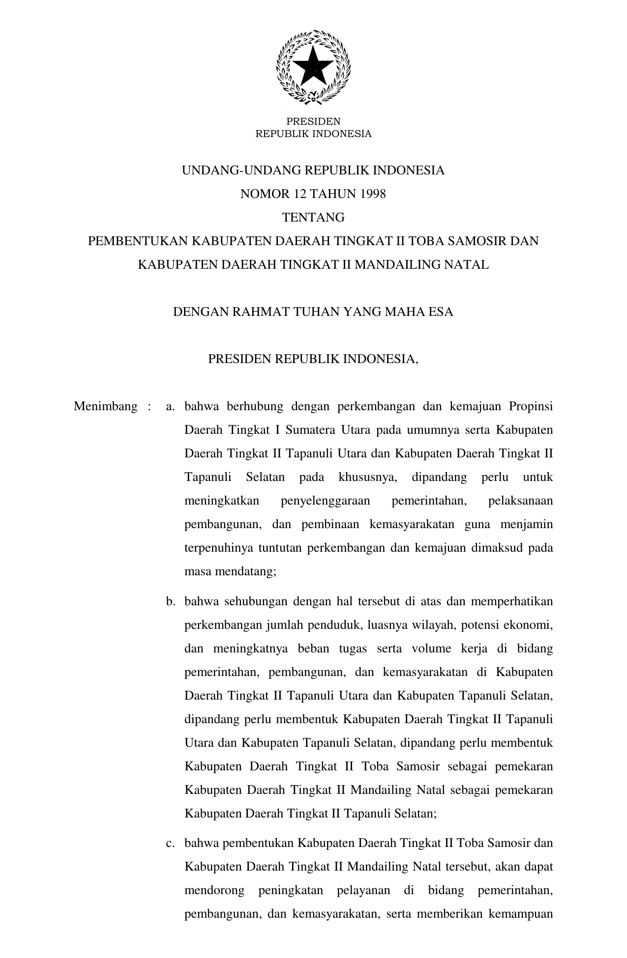 UU Nomor 12 Tahun 1998 | Undang-Undang Nomor 12 Tahun 1998 tentang PEMBENTUKAN KABUPATEN DAERAH TK II TOBA SAMOSIR DAN KABUPATEN DAERAH TK II MANDAILING NATAL
