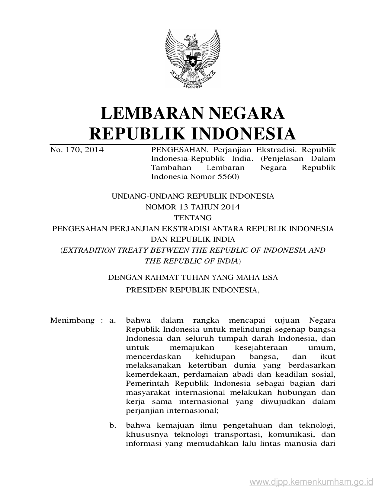 UU Nomor 13 Tahun 2014 | Undang-Undang Nomor 13 Tahun 2014 tentang PENGESAHAN PERJANJIAN EKSTRADISI ANTARA REPUBLIK INDONESIA DAN REPUBLIK INDIA (EXTRADITION TREATY BETWEEN THE REPUBLIC OF INDONESIA AND THE REPUBLIC OF INDIA)