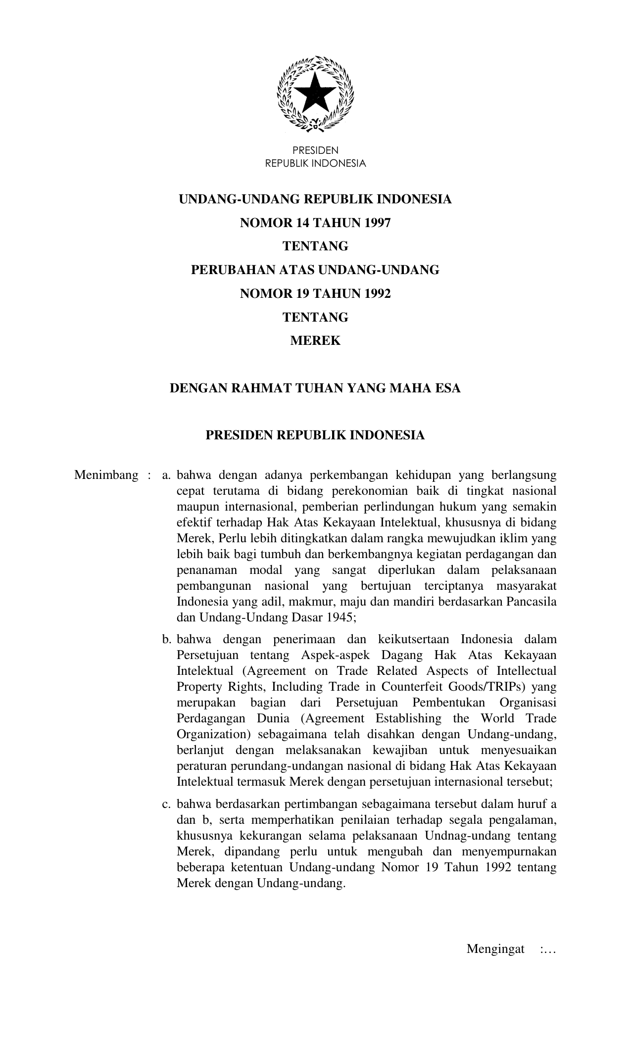 UU Nomor 14 Tahun 1997 | Undang-Undang Nomor 14 Tahun 1997 tentang PERUBAHAN UU 19-1992 TENTANG MEREK
