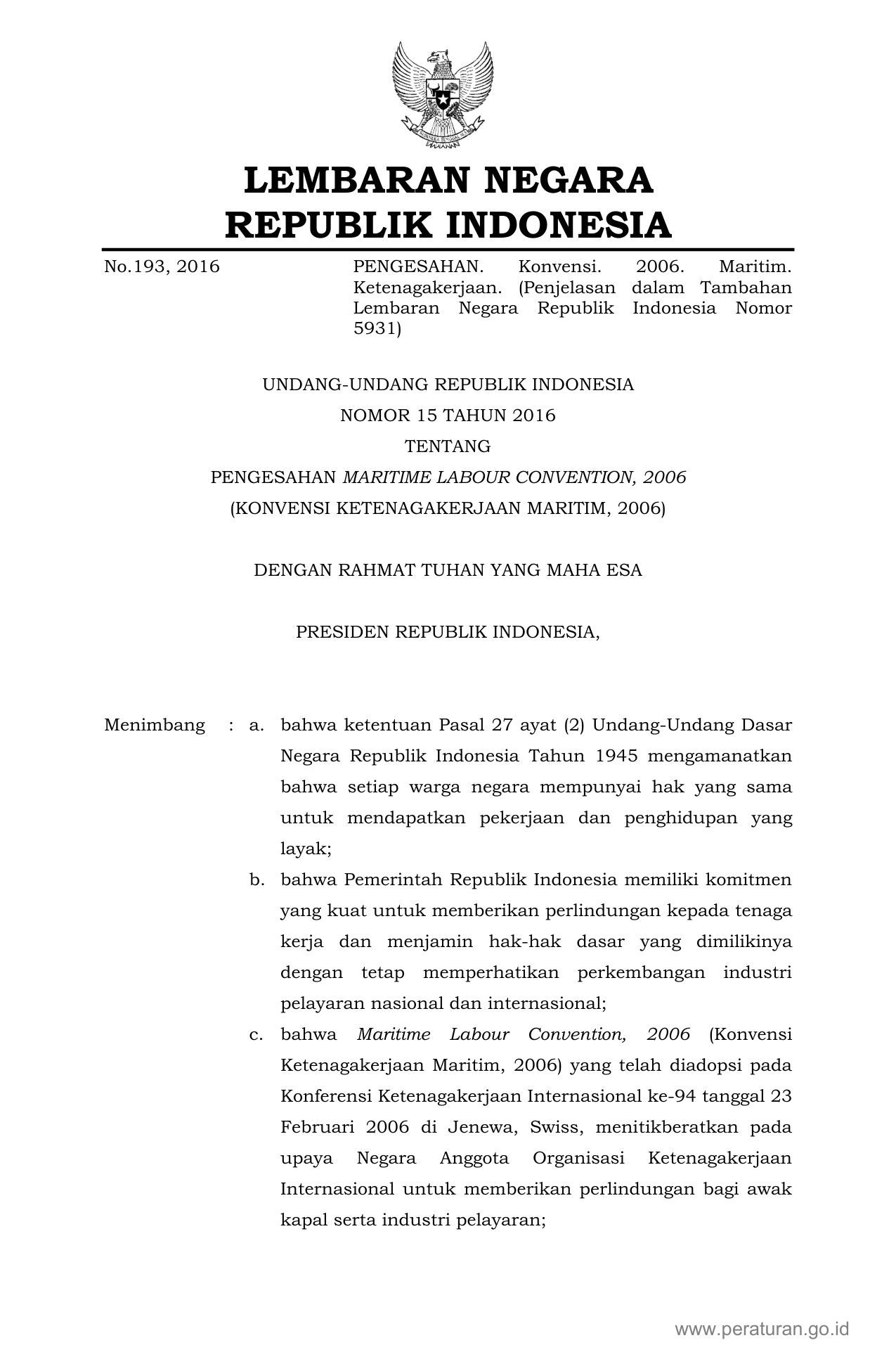 UU Nomor 15 Tahun 2016 | Undang-Undang Nomor 15 Tahun 2016 tentang PENGESAHAN MARITIME LABOUR CONVENTION 2006 KONVENSI KETENAGAKERJAAN MARITIM 2006