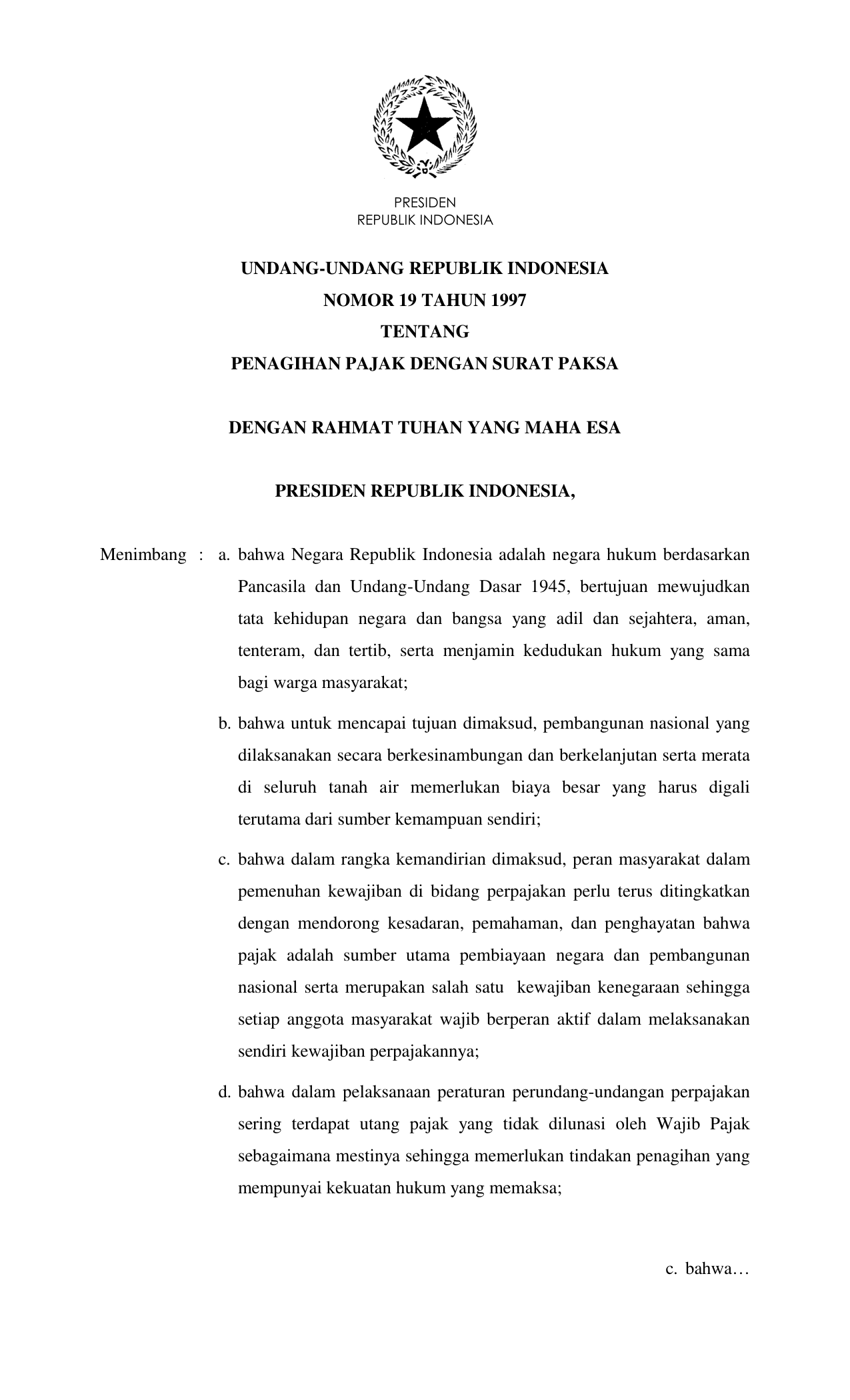 UU Nomor 19 Tahun 1997 | Undang-Undang Nomor 19 Tahun 1997 tentang PENAGIHAN PAJAK DENGAN SURAT PAKSA