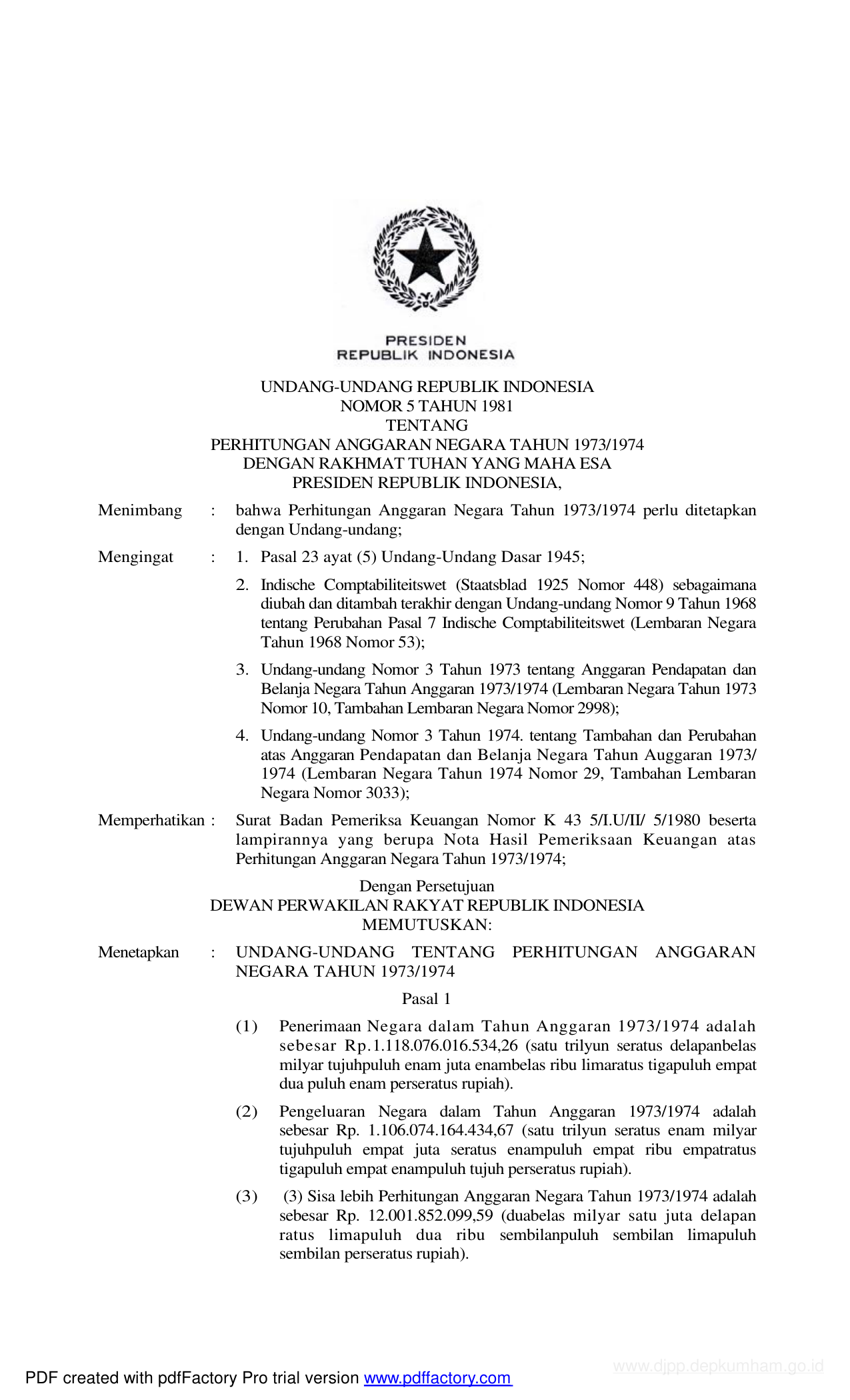 UU Nomor 5 Tahun 1981 | Undang-Undang Nomor 5 Tahun 1981 tentang PERHITUNGAN ANGGARAN NEGARA TAHUN 1973/1974