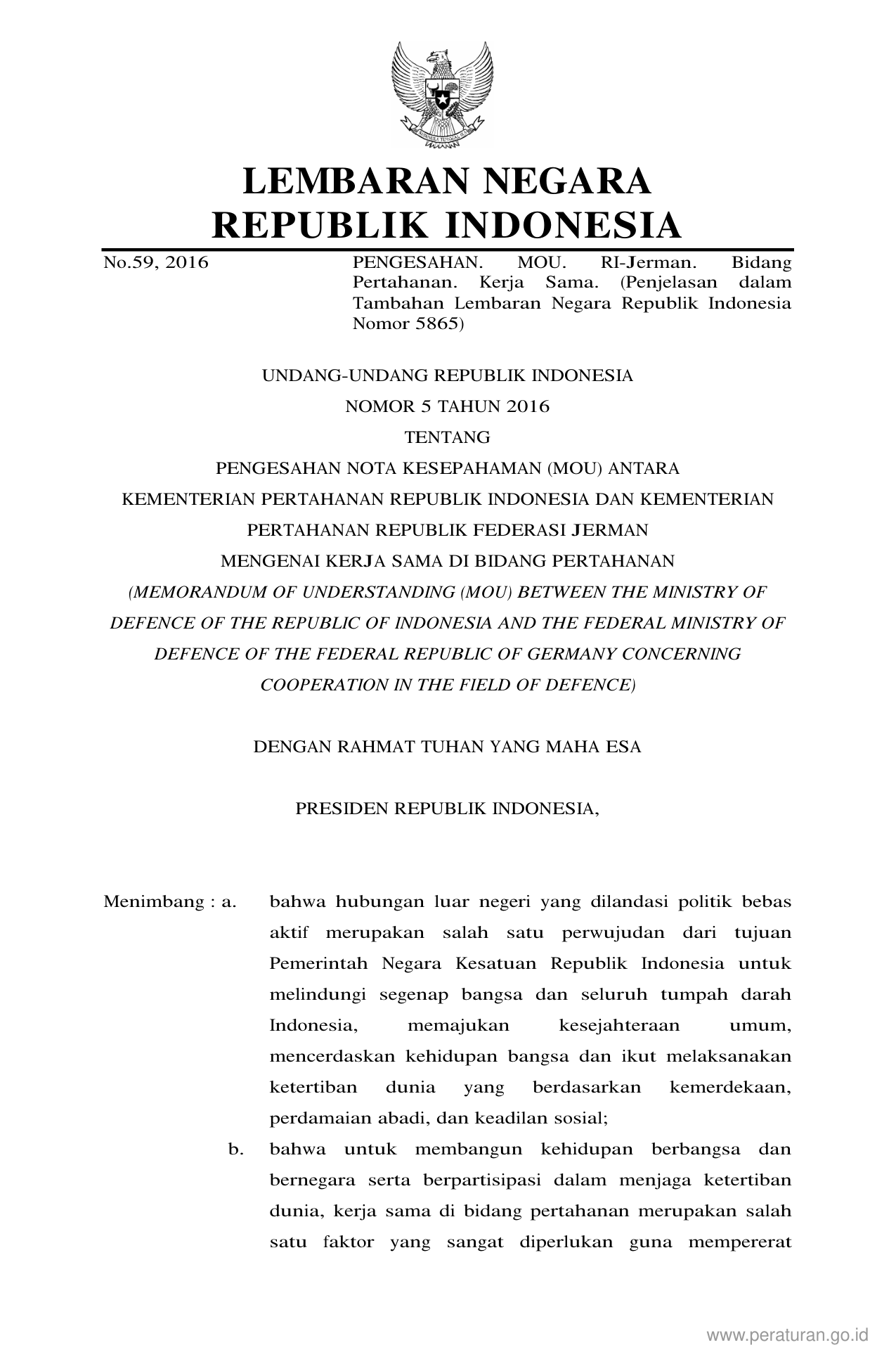 UU Nomor 5 Tahun 2016 | Undang-Undang Nomor 5 Tahun 2016 tentang PENGESAHAN NOTA KESEPAHAMAN (MOU) ANTARA KEMENTERIAN PERTAHANAN REPUBLIK INDONESIA DAN KEMENTERIAN PERTAHANAN REPUBLIK FEDERASI JERMAN MENGENAI KERJA SAMA DI BIDANG PERTAHANAN (MEMORANDUM OF UNDERSTANDING (MOU) BETWEEN THE MINISTRY OF DEFENCE OF THE REPUBLIC OF INDONESIA AND THE FEDERAL MINISTRY OF DEFENCE OF THE FEDERAL REPUBLIC OF GERMANY CONCERNING COOPERATION IN THE FIELD OF DEFENCE)