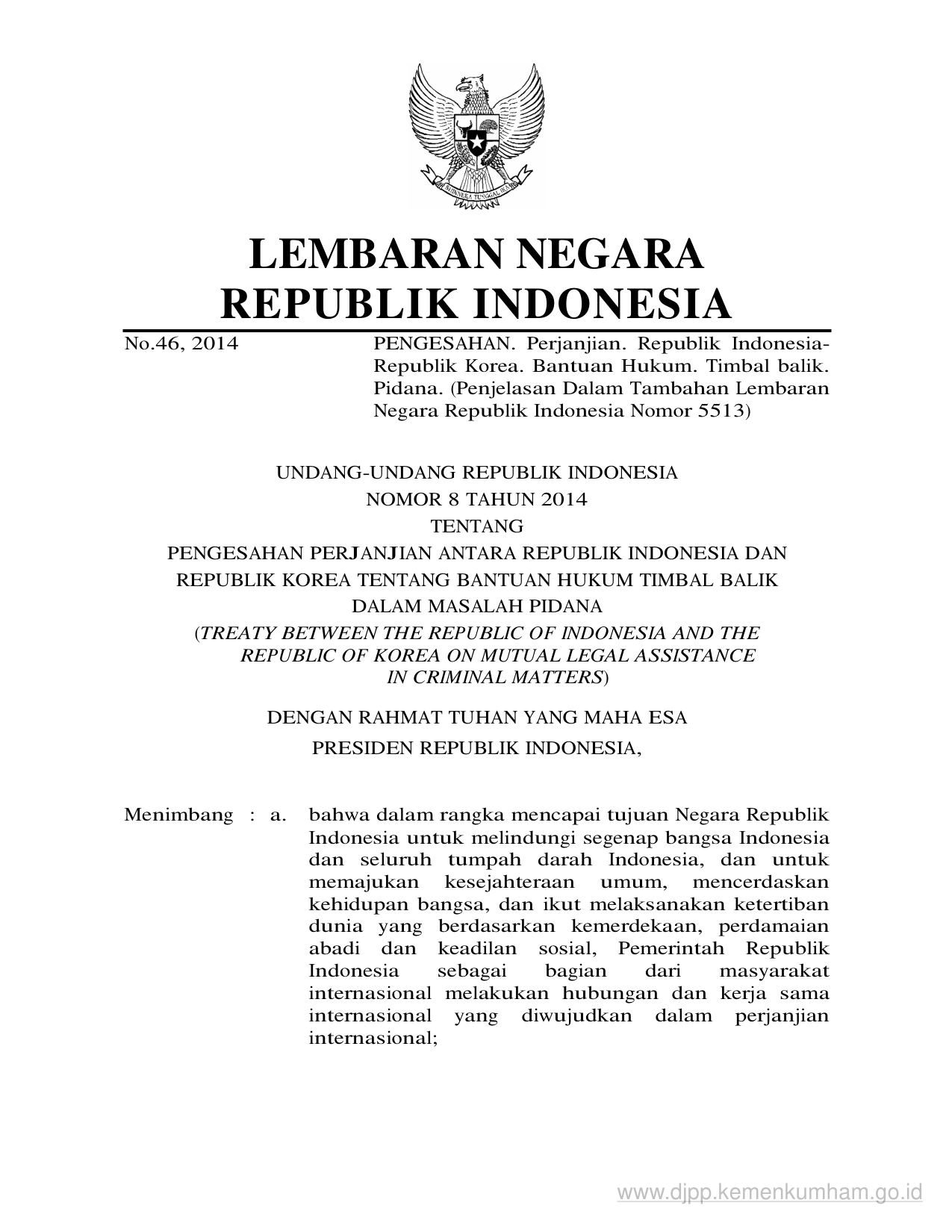 UU Nomor 8 Tahun 2014 | Undang-Undang Nomor 8 Tahun 2014 tentang PENGESAHAN PERJANJIAN ANTARA REPUBLIK INDONESIA DAN REPUBLIK KOREA TENTANG BANTUAN HUKUM TIMBAL BALIK DALAM MASALAH PIDANA (TREATY BETWEEN THE REPUBLIC OF INDONESIA AND THE REPUBLIC OF KOREA ON MUTUAL LEGAL ASSISTANCE IN CRIMINAL MATTERS)