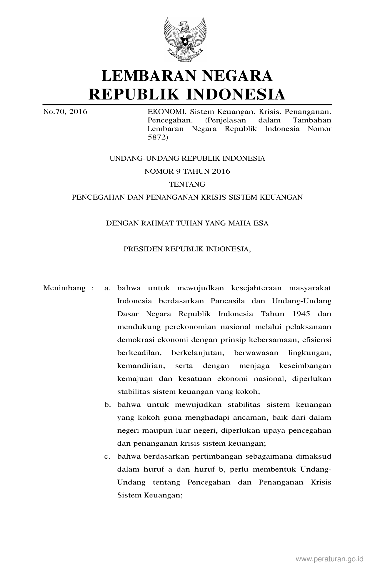 UU Nomor 9 Tahun 2016 | Undang-Undang Nomor 9 Tahun 2016 tentang PENCEGAHAN DAN PENANGANAN KRISIS SISTEM KEUANGAN