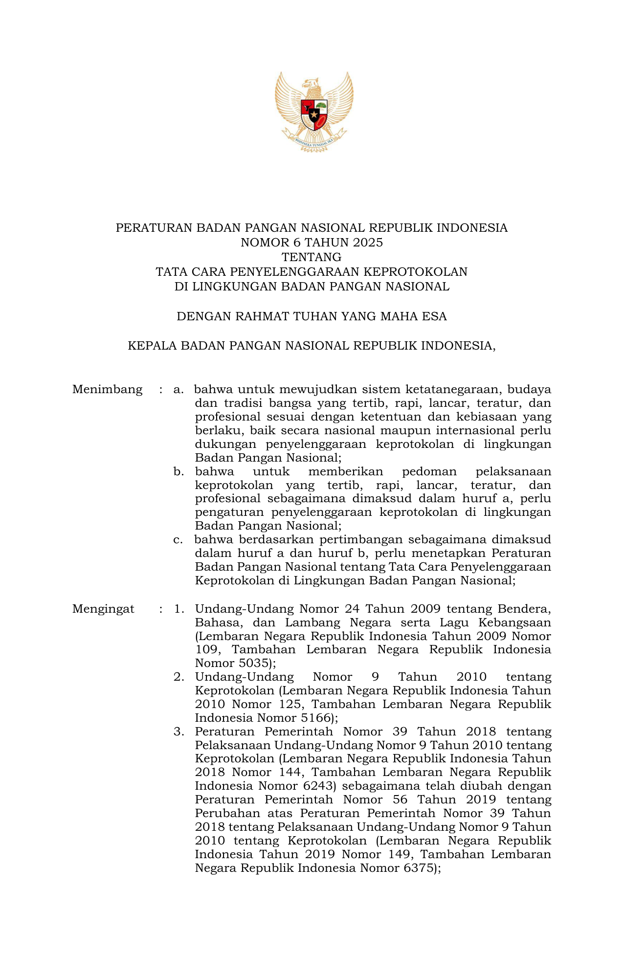 PERBAN Nomor 6 Tahun 2025 | Peraturan Badan Nomor 6 Tahun 2025 tentang Tata Cara Penyelenggaraan Keprotokolan di Lingkungan Badan Pangan Nasional