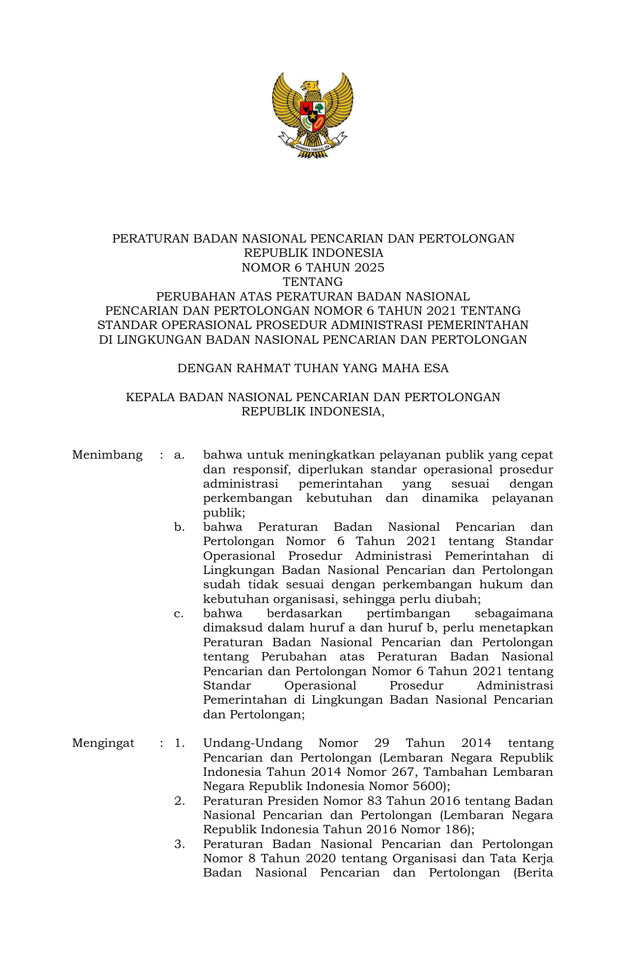 PERBAN Nomor 6 Tahun 2025 | Peraturan Badan Nomor 6 Tahun 2025 tentang Perubahan atas Peraturan Badan Nasional Pencarian dan Pertolongan Nomor 6 Tahun 2021 tentang Standar Operasional Prosedur Administrasi Pemerintahan di Lingkungan Badan Nasional Pencarian dan Pertolongan