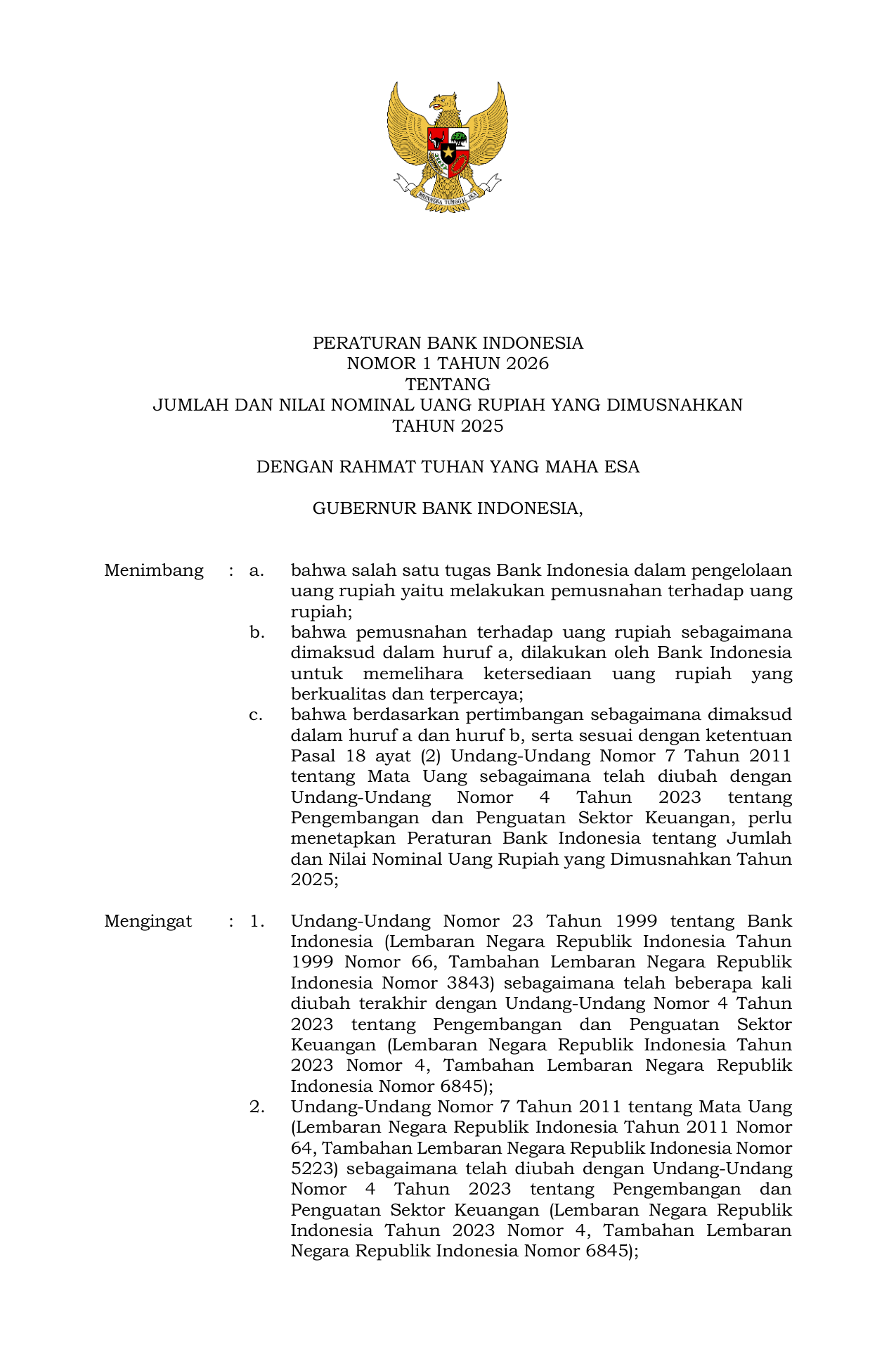 PERBAN Nomor 1 Tahun 2026 | Peraturan Badan Nomor 1 Tahun 2026 tentang Jumlah dan Nilai Nominal Uang Rupiah yang Dimusnahkan Tahun 2025