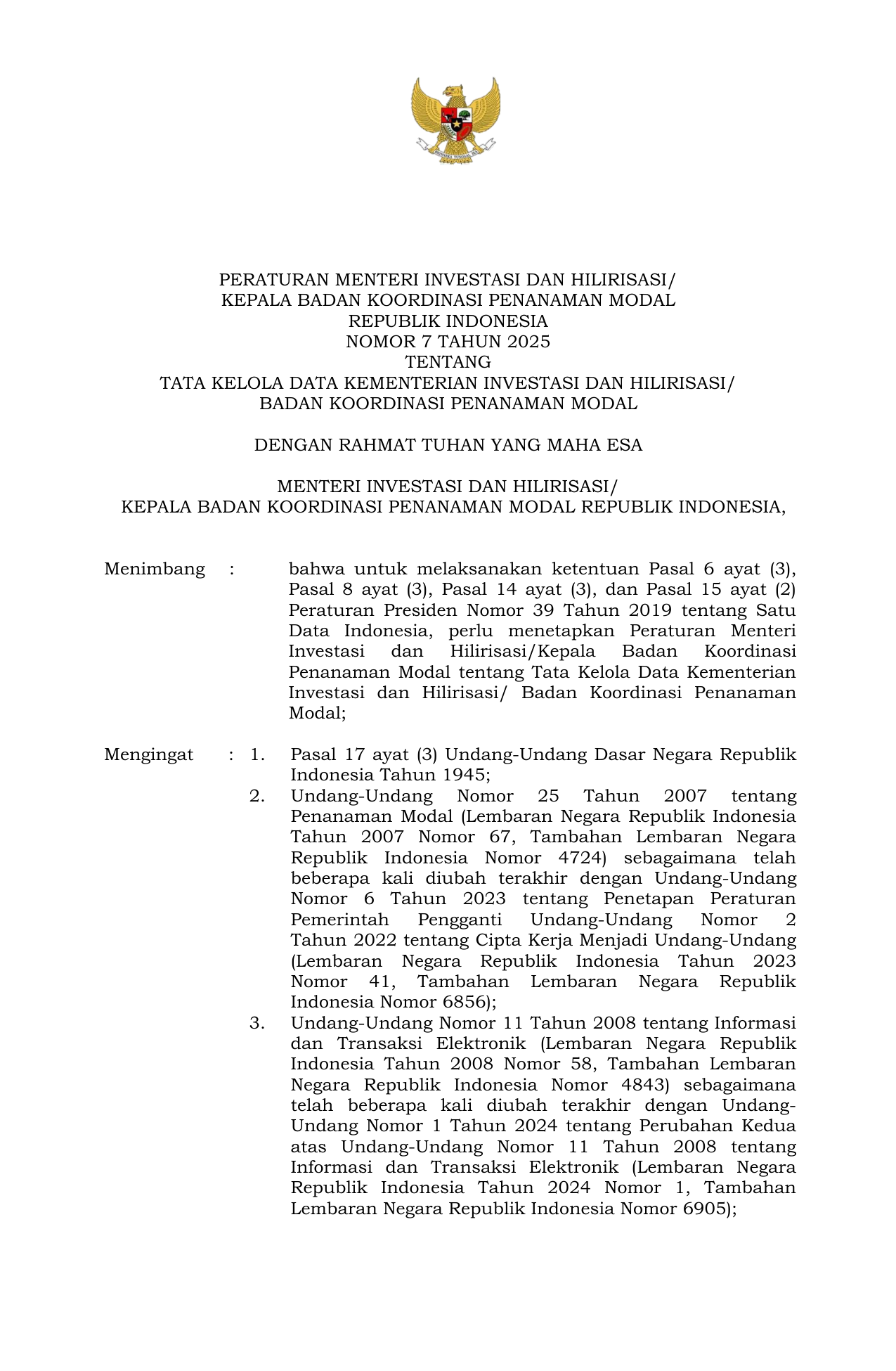 PERBAN Nomor 7 Tahun 2025 | Peraturan Badan Nomor 7 Tahun 2025 tentang Tata Kelola Data Kementerian Investasi dan Hilirisasi Badan Koordinasi Penanaman Modal