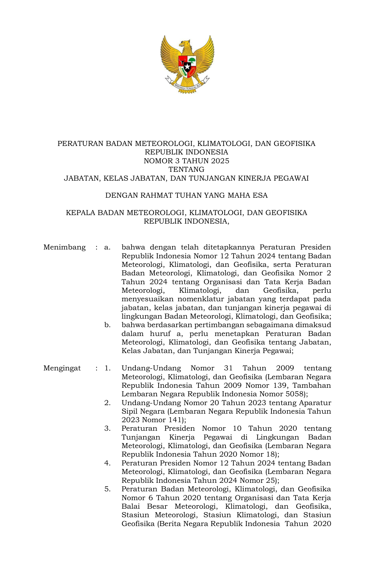 PERBAN Nomor 3 Tahun 2025 | Peraturan Badan Nomor 3 Tahun 2025 tentang Jabatan Kelas Jabatan dan Tunjangan Kinerja Pegawai