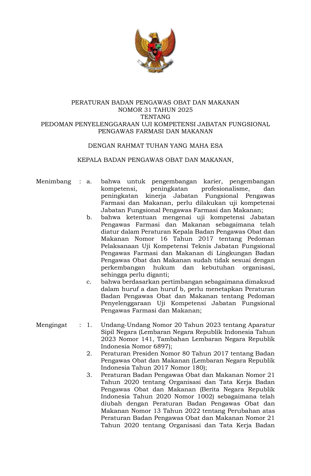 PERBAN Nomor 31 Tahun 2025 | Peraturan Badan Nomor 31 Tahun 2025 tentang Pedoman Penyelenggaraan Uji Kompetensi Jabatan Fungsional Pengawas Farmasi dan Makanan