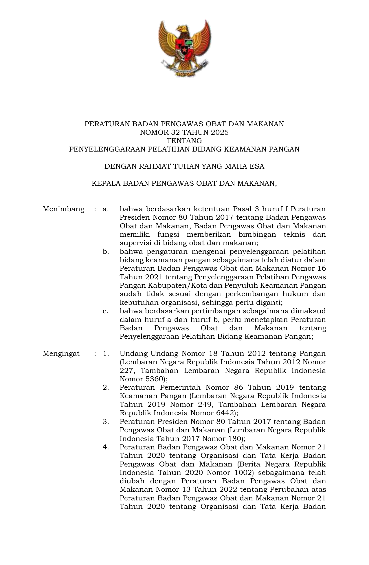 PERBAN Nomor 32 Tahun 2025 | Peraturan Badan Nomor 32 Tahun 2025 tentang Penyelenggaraan Pelatihan Bidang Keamanan Pangan