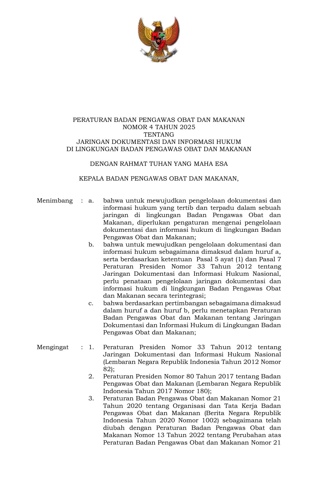 PERBAN Nomor 4 Tahun 2025 | Peraturan Badan Nomor 4 Tahun 2025 tentang Jaringan Dokumentasi dan Informasi Hukum di Lingkungan Badan Pengawas Obat dan Makanan