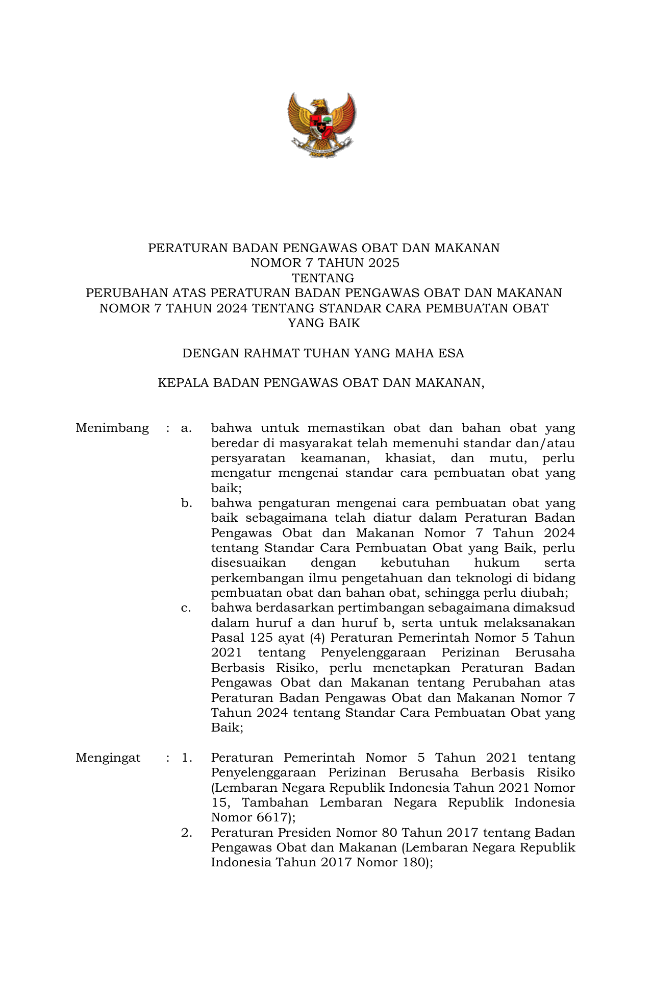 PERBAN Nomor 7 Tahun 2025 | Peraturan Badan Nomor 7 Tahun 2025 tentang Perubahan atas Peraturan Badan Pengawas Obat dan Makanan Nomor 7 Tahun 2024 tentang Standar Cara Pembuatan Obat yang Baik