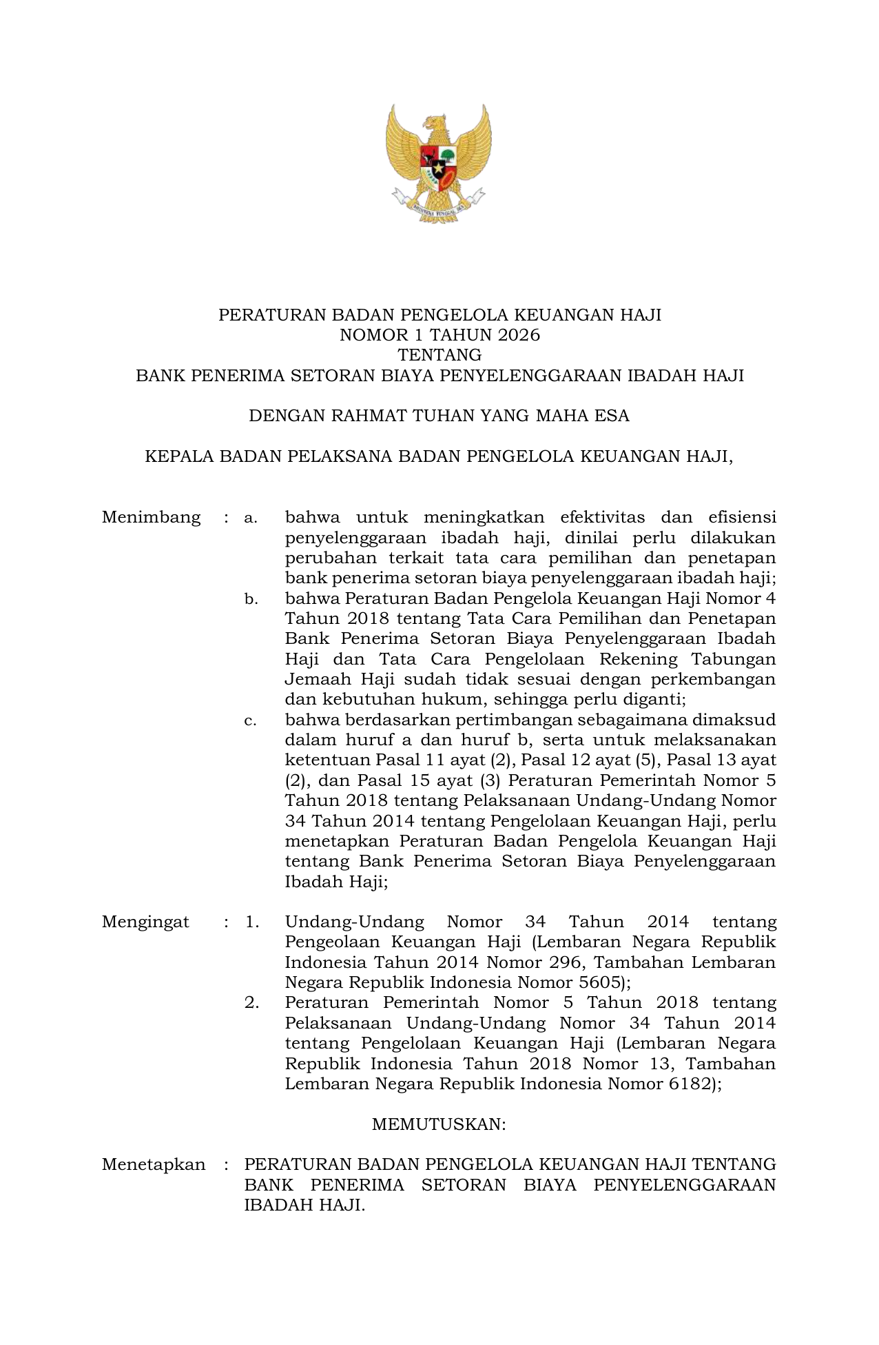PERBAN Nomor 1 Tahun 2026 | Peraturan Badan Nomor 1 Tahun 2026 tentang Bank Penerima Setoran Biaya Penyelenggaraan Ibadah Haji