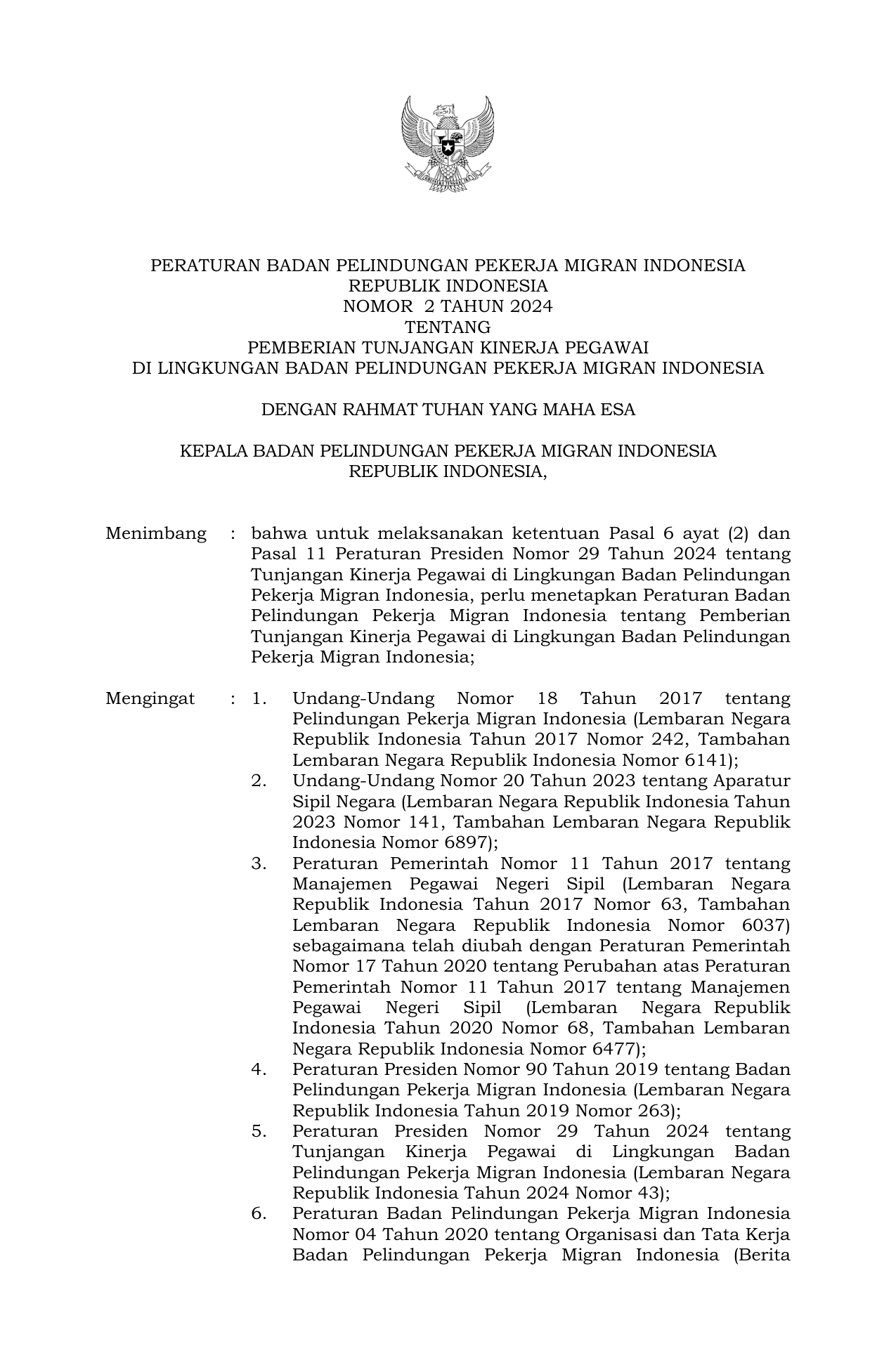 PERBAN Nomor 2 Tahun 2024 | Peraturan Badan Nomor 2 Tahun 2024 tentang Pemberian Tunjangan Kinerja Pegawai di Lingkungan Badan Pelindungan Pekerja Migran Indonesia