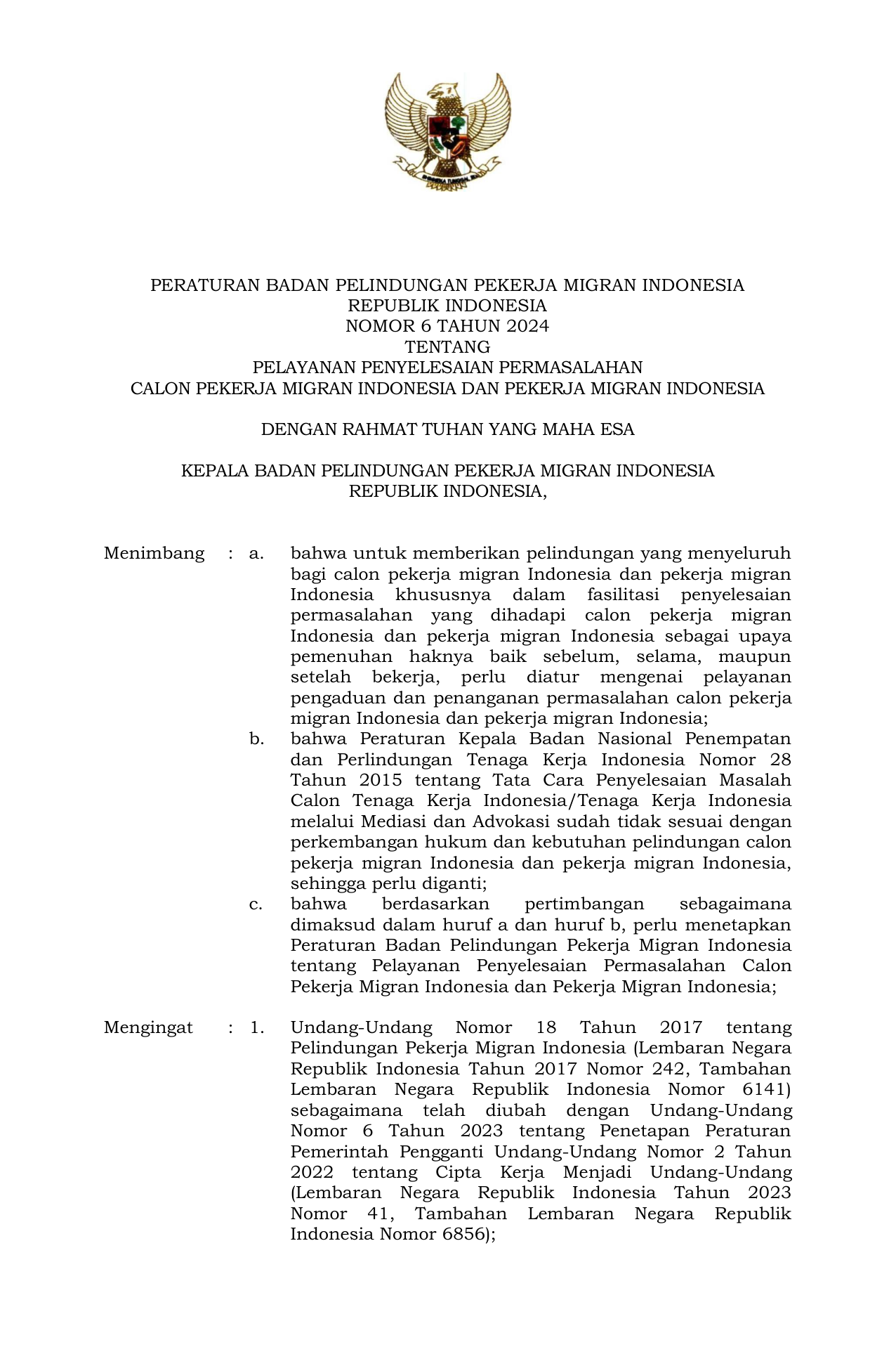 PERBAN Nomor 6 Tahun 2024 | Peraturan Badan Nomor 6 Tahun 2024 tentang Pelayanan Penyelesaian Permasalahan Calon Pekerja Migran Indonesia dan Pekerja Migran Indonesia