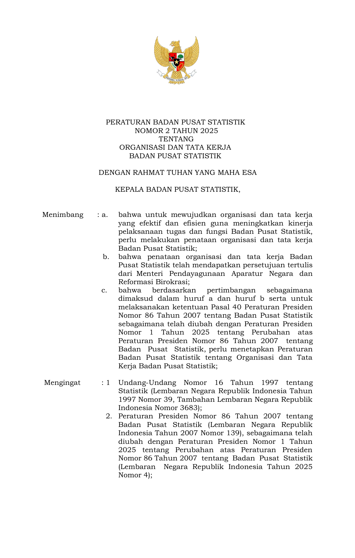 PERBAN Nomor 2 Tahun 2025 | Peraturan Badan Nomor 2 Tahun 2025 tentang Organisasi dan Tata Kerja Badan Pusat Statistik