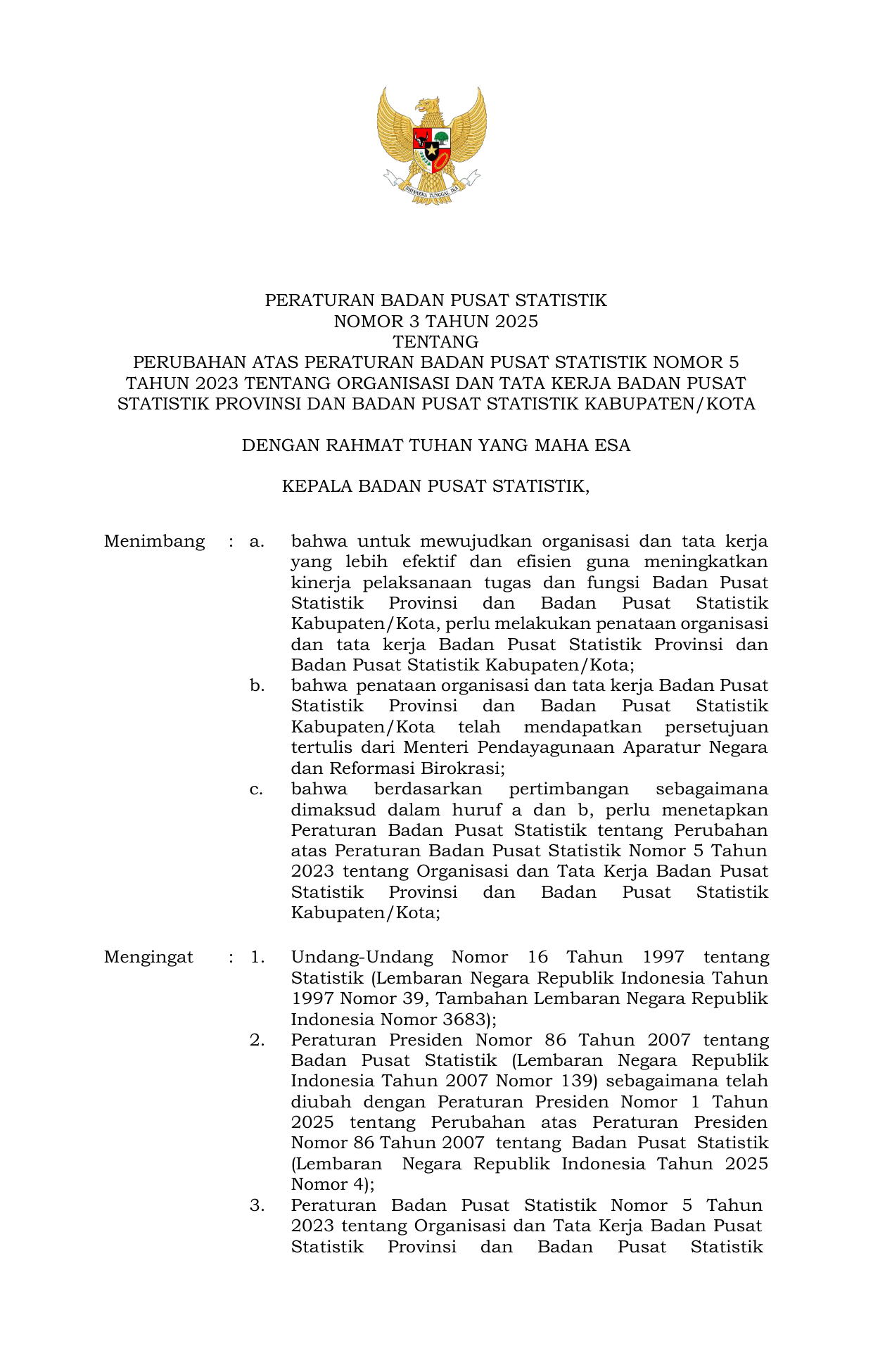 PERBAN Nomor 3 Tahun 2025 | Peraturan Badan Nomor 3 Tahun 2025 tentang Perubahan Atas Peraturan Badan Pusat Statistik Nomor 5 Tahun 2023 Tentang Organisasi Dan Tata Kerja Badan Pusat Statistik Provinsi Dan Badan Pusat Statistik Kabupaten Kota