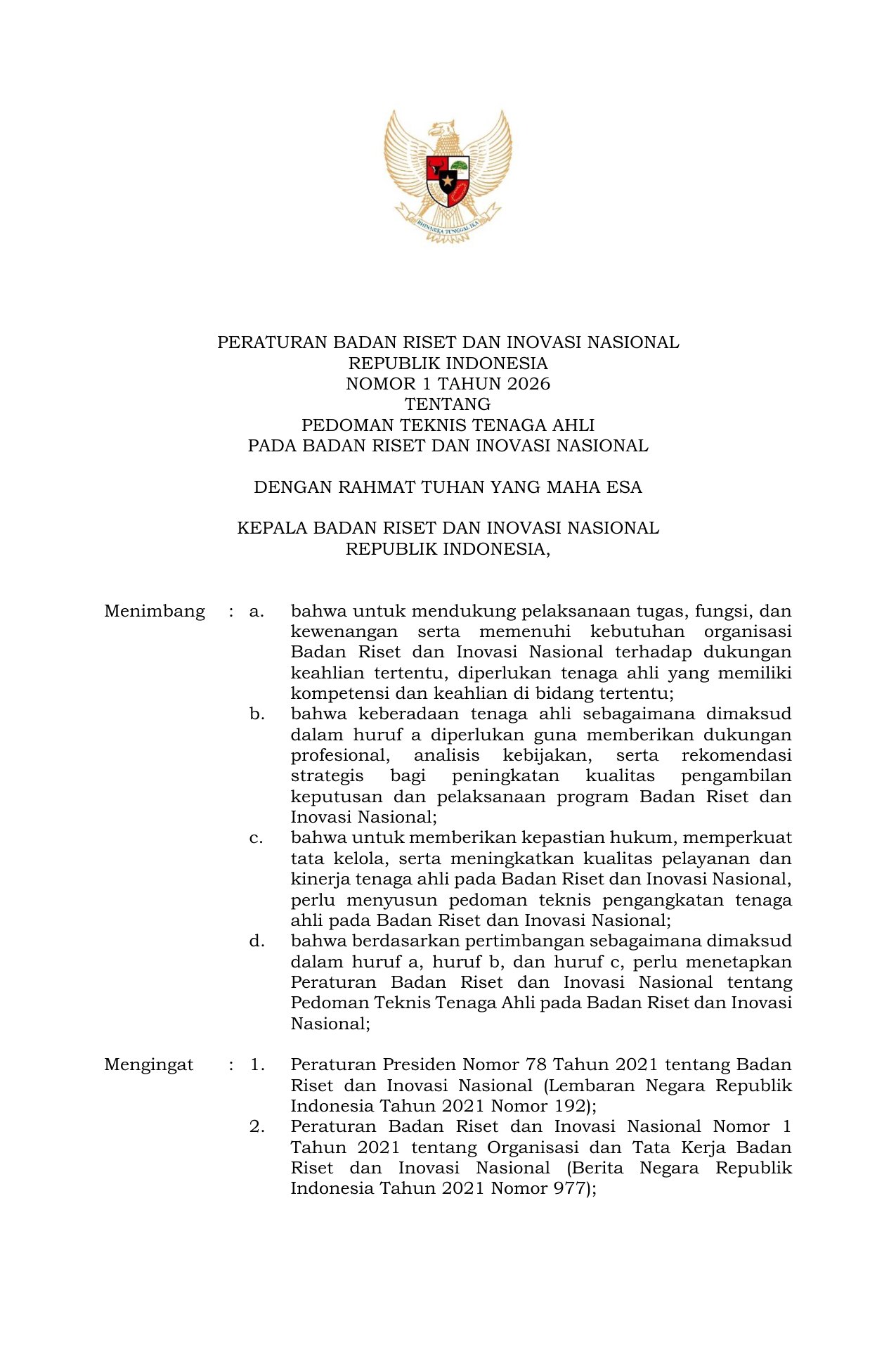 PERBAN Nomor 1 Tahun 2026 | Peraturan Badan Nomor 1 Tahun 2026 tentang Pedoman Teknis Tenaga Ahli pada Badan Riset dan Inovasi Nasional
