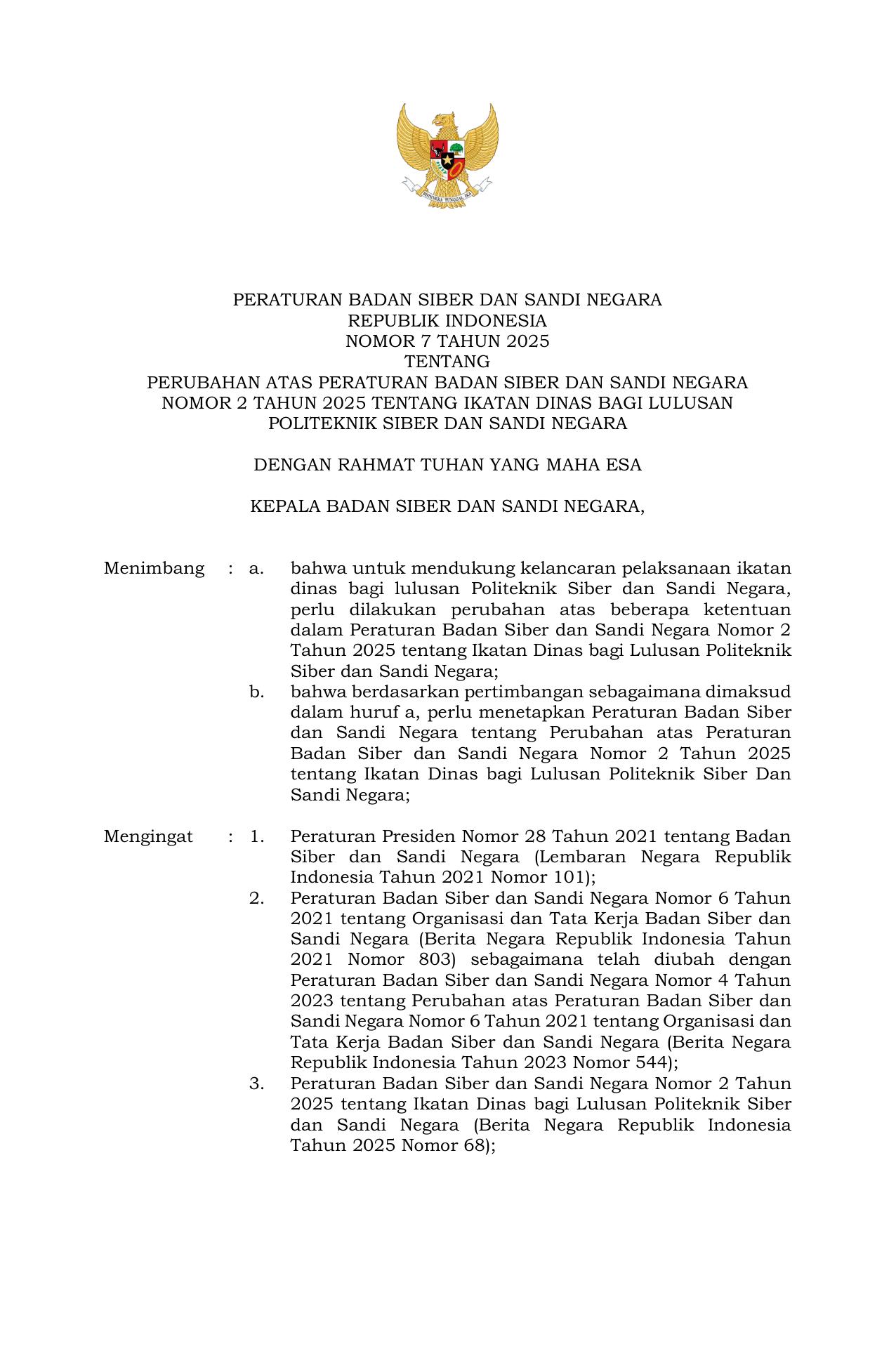 PERBAN Nomor 7 Tahun 2025 | Peraturan Badan Nomor 7 Tahun 2025 tentang Perubahan atas Peraturan Badan Siber dan Sandi Negara Nomor 2 Tahun 2025 tentang Ikatan Dinas bagi Lulusan Politeknik Siber dan Sandi Negara