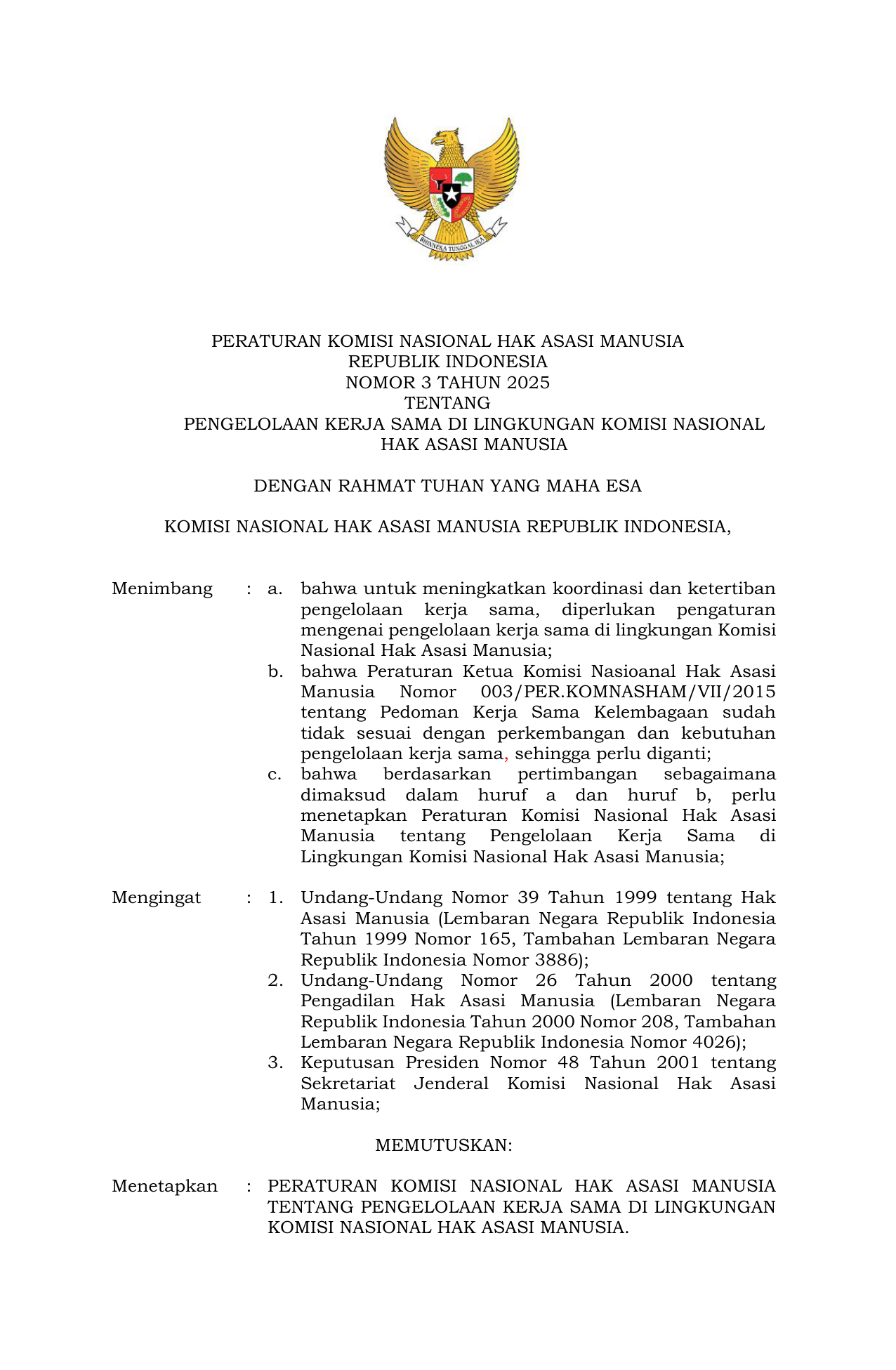 PERBAN Nomor 3 Tahun 2025 | Peraturan Badan Nomor 3 Tahun 2025 tentang Pengelolaan Kerja Sama di Lingkungan Komisi Nasional Hak Asasi Manusia
