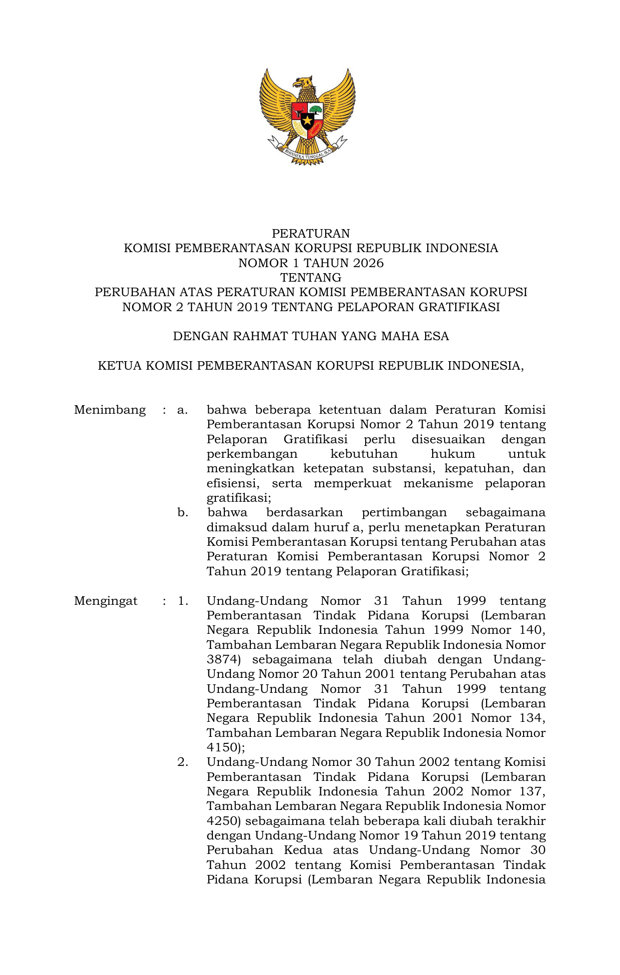 PERBAN Nomor 1 Tahun 2026 | Peraturan Badan Nomor 1 Tahun 2026 tentang TENTANG PERUBAHAN ATAS PERATURAN KOMISI PEMBERANTASAN KORUPSI NOMOR 2 TAHUN 2019 TENTANG PELAPORAN GRATIFIKASI
