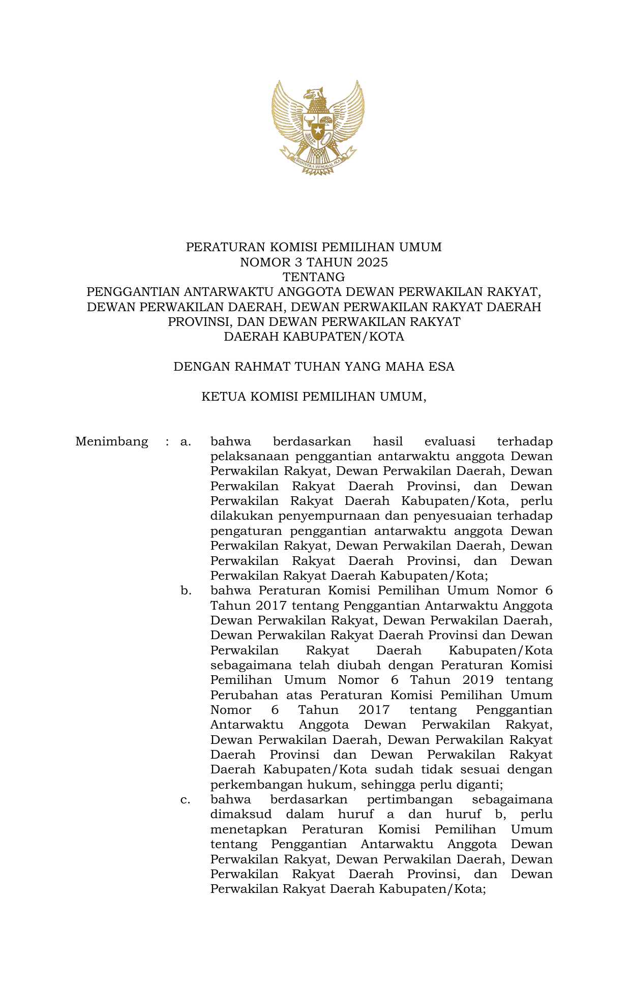 PERBAN Nomor 3 Tahun 2025 | Peraturan Badan Nomor 3 Tahun 2025 tentang Penggantian Antarwaktu Anggota Dewan Perwakilan Rakyat Dewan Perwakilan Daerah Dewan Perwakilan Rakyat Daerah Provinsi dan Dewan Perwakilan Rakyat Daerah Kabupaten Kota