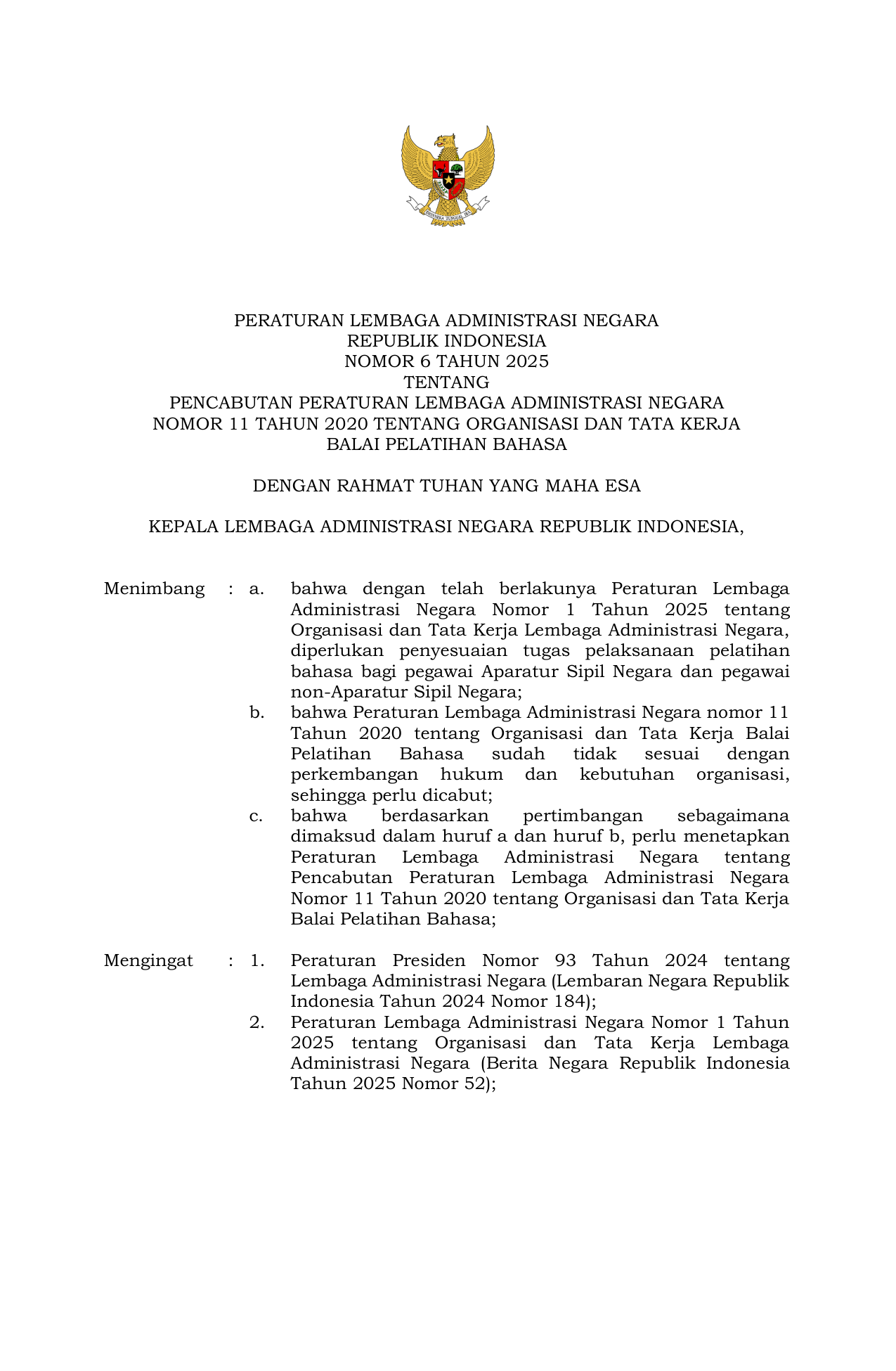 PERBAN Nomor 6 Tahun 2025 | Peraturan Badan Nomor 6 Tahun 2025 tentang Peraturan Lembaga Administrasi Negara tentang Pencabutan Peraturan Lembaga Administrasi Negara Nomor 11 Tahun 2020 tentang Organisasi dan Tata Kerja Balai Pelatihan Bahasa