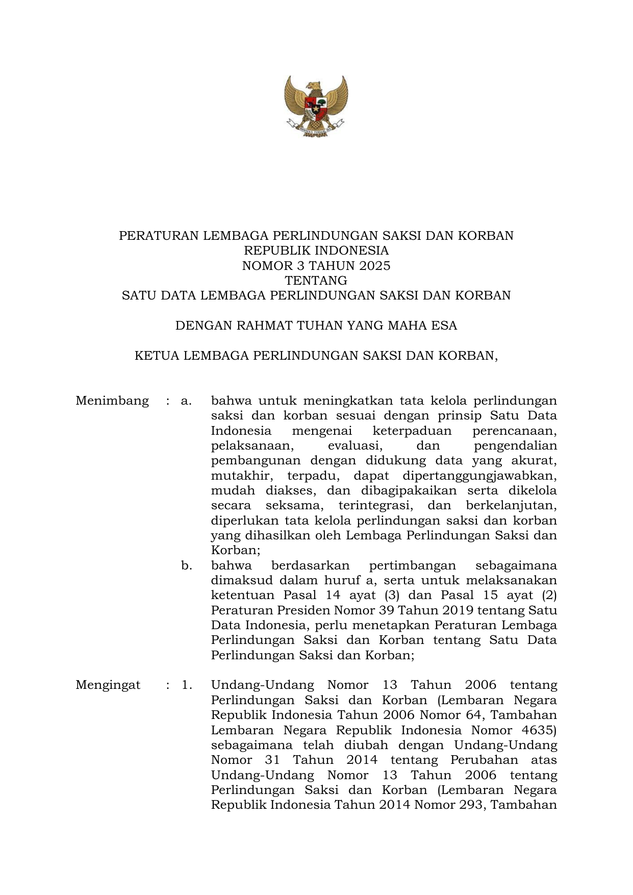 PERBAN Nomor 3 Tahun 2025 | Peraturan Badan Nomor 3 Tahun 2025 tentang SATU DATA LEMBAGA PERLINDUNGAN SAKSI DAN KORBAN