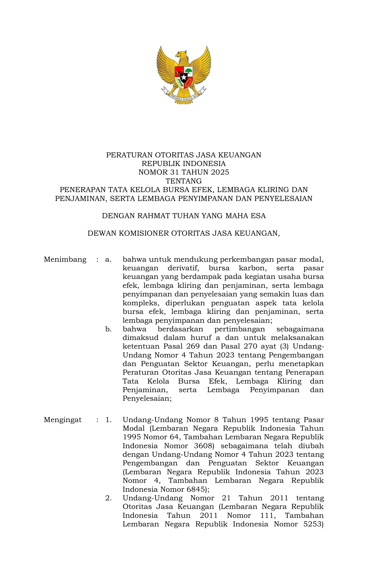 PERBAN Nomor 31 Tahun 2025 | Peraturan Badan Nomor 31 Tahun 2025 tentang Penerapan Tata Kelola Bursa Efek Lembaga Kliring dan Penjaminan serta Lembaga Penyimpanan dan Penyelesaian